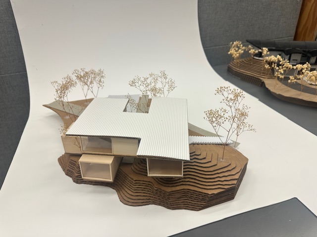 modernist exterior shot watercolor render of looking at building from the outside architecture