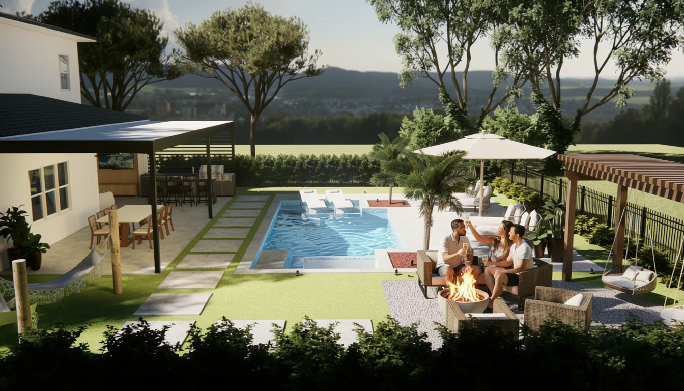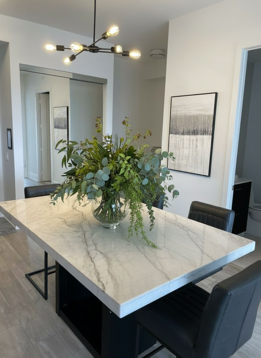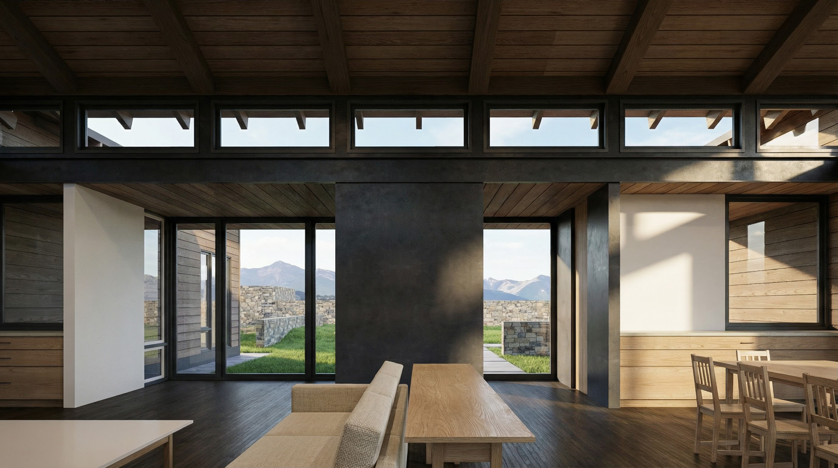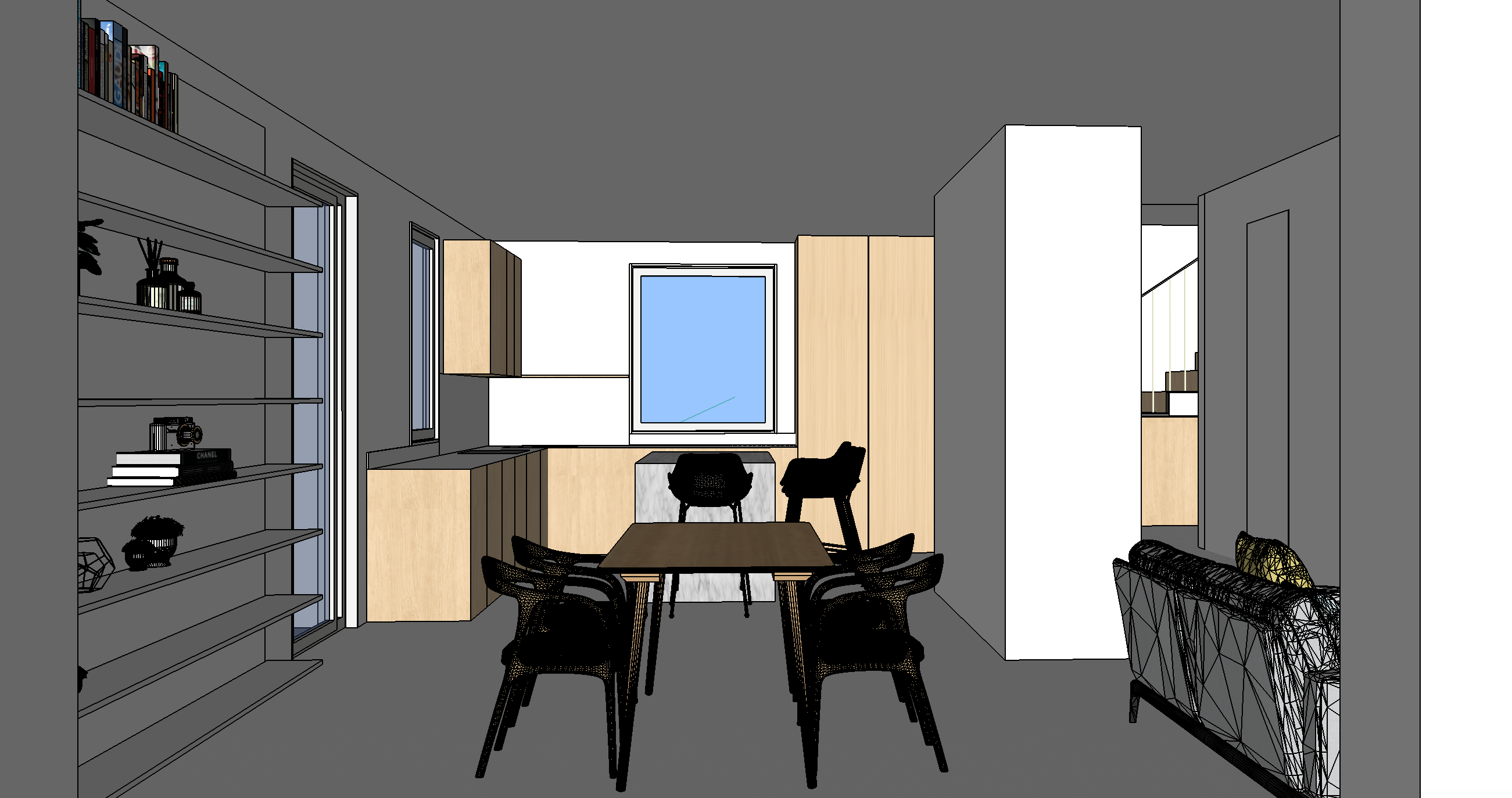 i woudl like a photorealistic rendering its an interior white terrazzo on the floor chairs in wood light color the bookshelv on the left is metal white the winfows are light grey the central element in the kitchen is natural stone beige