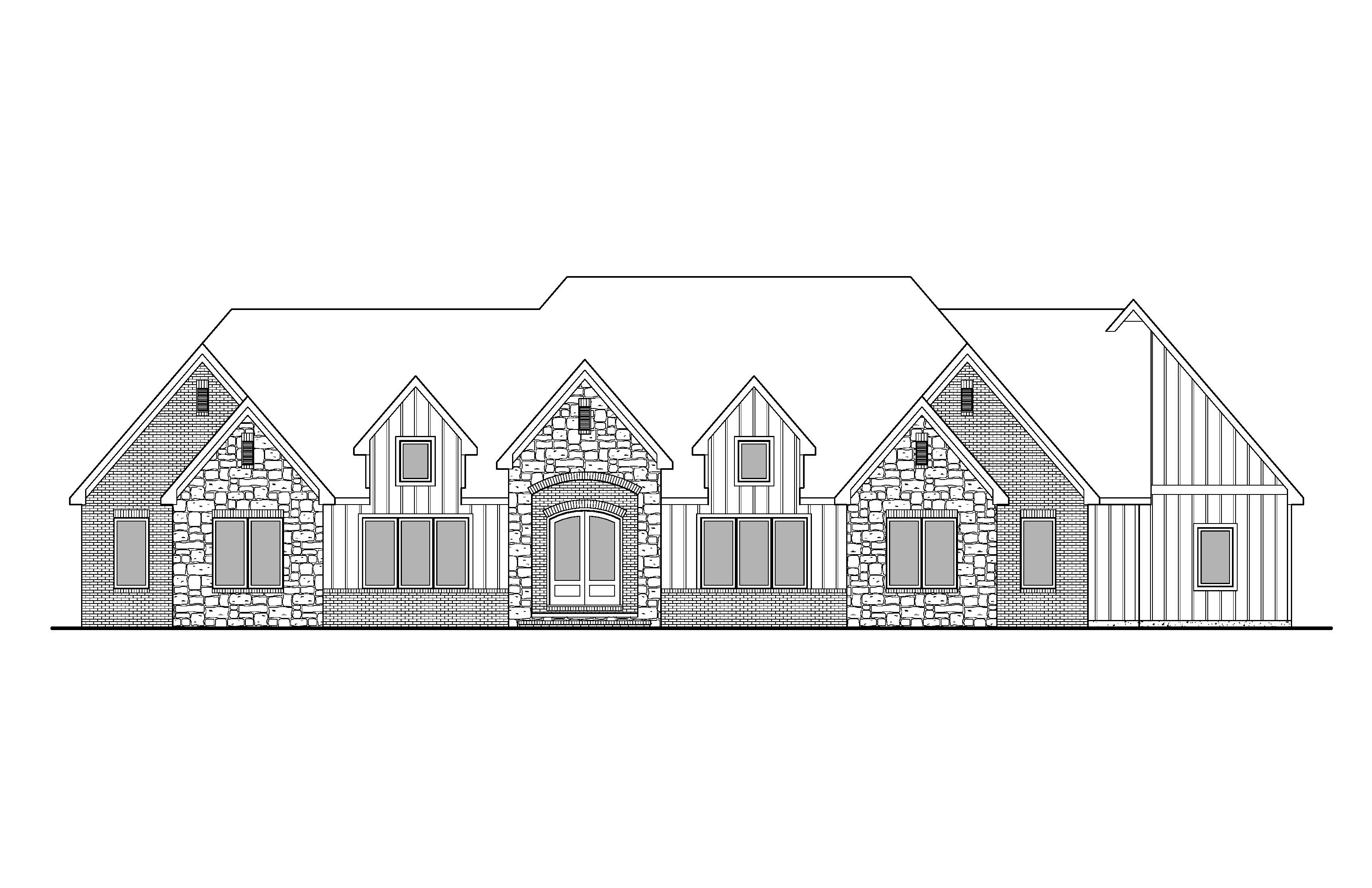 create photorealistic three dimensional image of home with modern materials for brick and stone in locations indicated with black windows and wood front door rendering in a suburban setting with vegetation and on a sunny clear day with a few clouds in the sky
