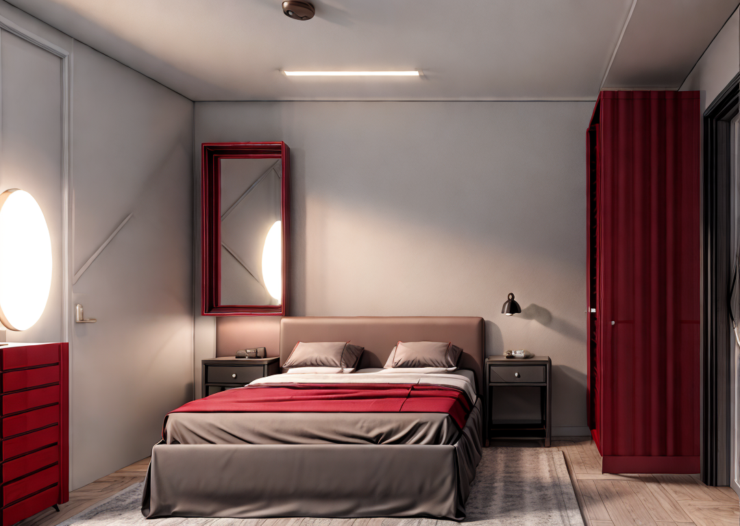exterior shot a modern minimalist house with crisp white walls and large glass windows featuring a deep terracotta red roof the sky is a gradient from soft blue to light pink creating a serene and peaceful atmosphere sunlight casts gentle shadows highlighting the structure s clean lines a single small leafless tree stands beside the house its branches casting intricate shadows on the white ground