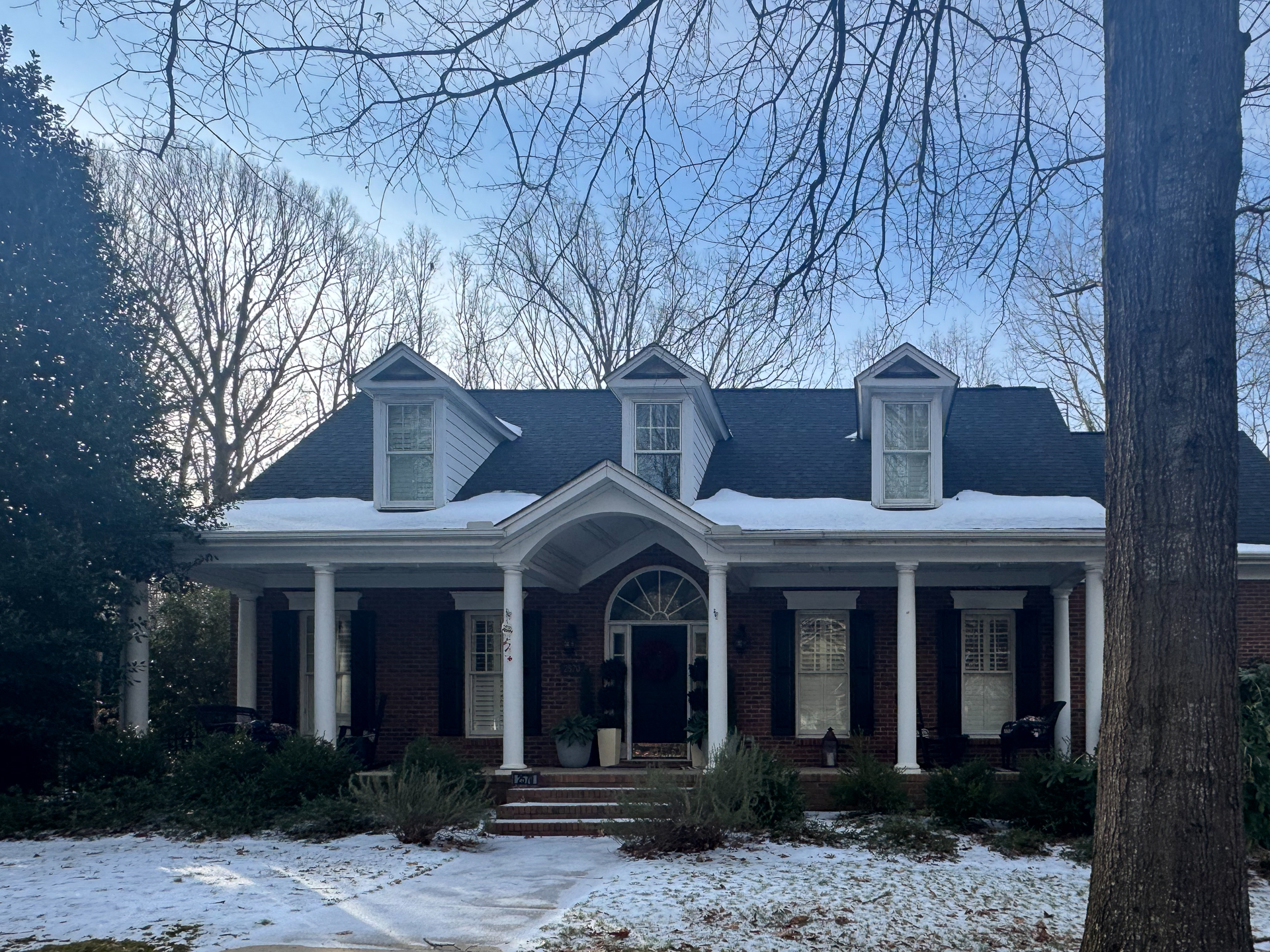 grainy watercolor render of this house with maintaining all the origianl materials watercolor trees and landscaping surrounding the building
