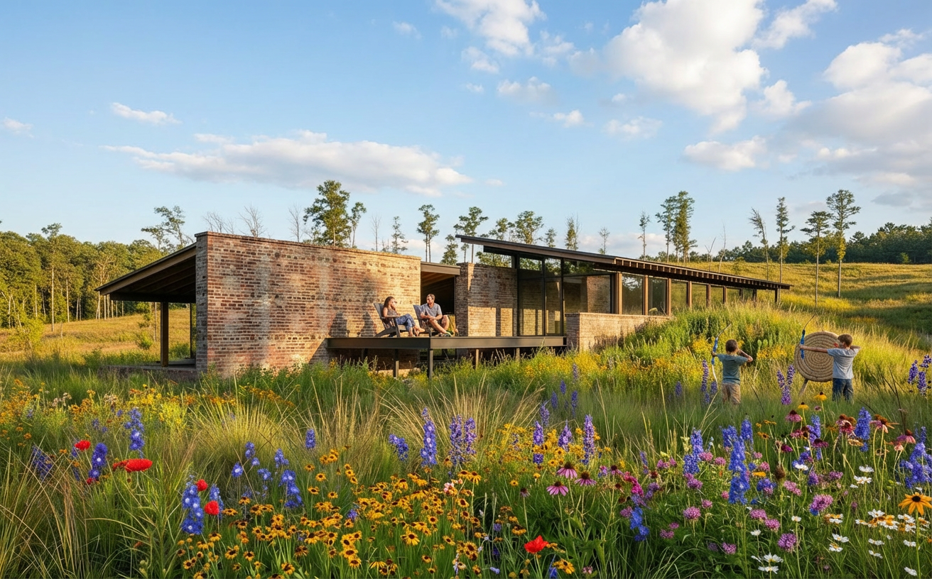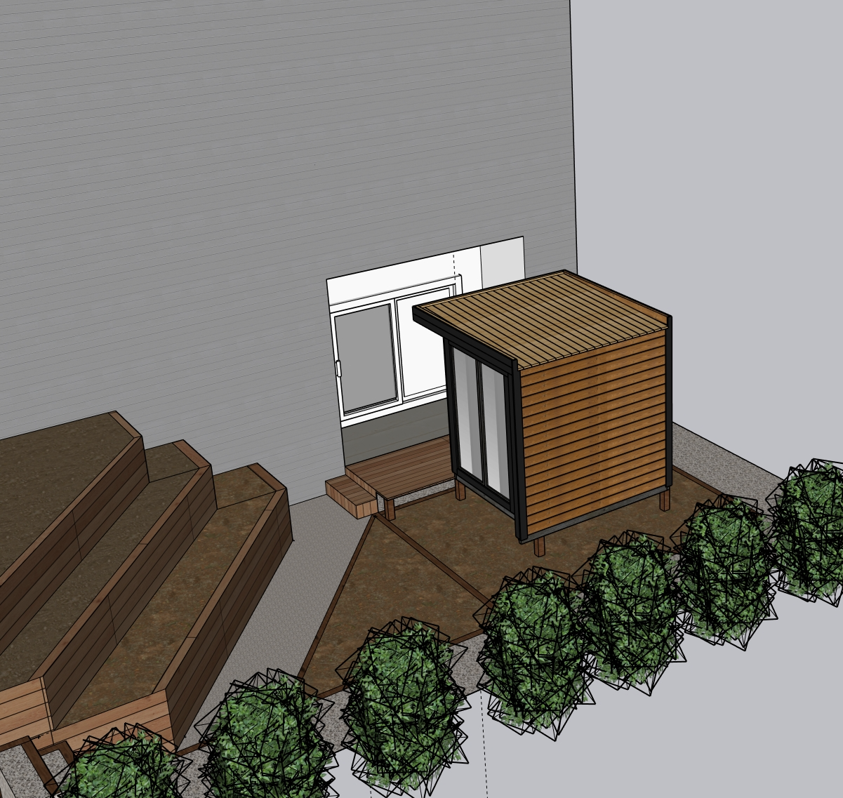 a modern backyard scene with a small wooden structure featuring a roof and walls in natural warm brown tones with a touch of deep charcoal for the frame surround the area with a lush hedge of vibrant green foliage the ground is a mixture of textured earth and gravel pathways in soft gray include a blossoming tree with delicate pink and white flowers providing a serene and peaceful atmosphere the overall lighting is warm and inviting suggesting a sunny afternoon
