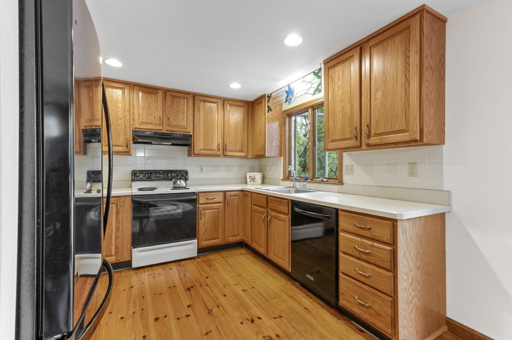 update this kitchen with butcher block countertops white painted cabinets using the same cabinet door style in the current photo also update to new stainless steel appliances keep the walls and flooring the same
