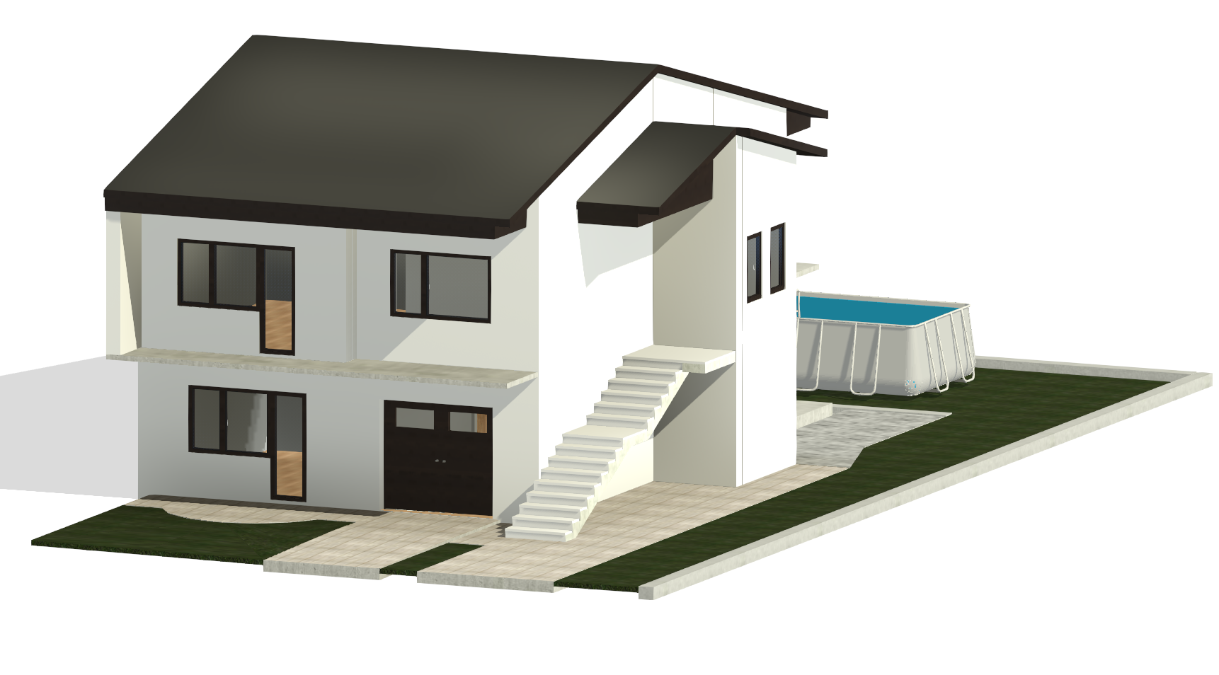 modern exterior shot a modern minimalist two story house with a soft white exterior and sleek black framed windows the roof is a deep charcoal gray adding a touch of elegance a light stone pathway leads to the entrance complementing the lush green lawn a raised rectangular pool with crystal clear water sits to the right providing a serene atmosphere the sun casts gentle warm lighting enhancing the sophisticated yet cozy ambiance architecture