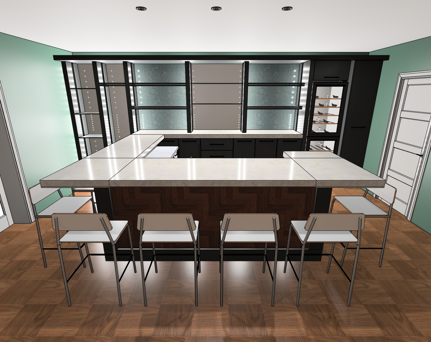 add bottles on shelves to back of bar where light grey solid panels are to be mirrors the face of the underside on the bar where herrinbone shown to be leather grey panelled the top of the bar to be light through onyx