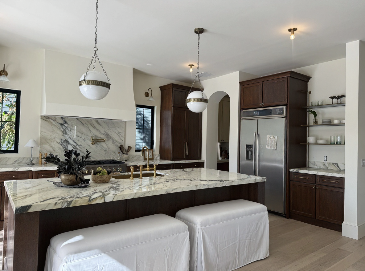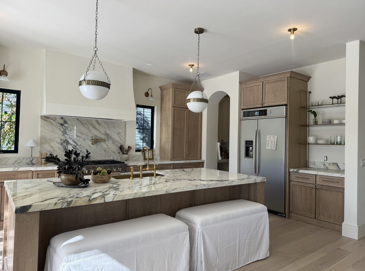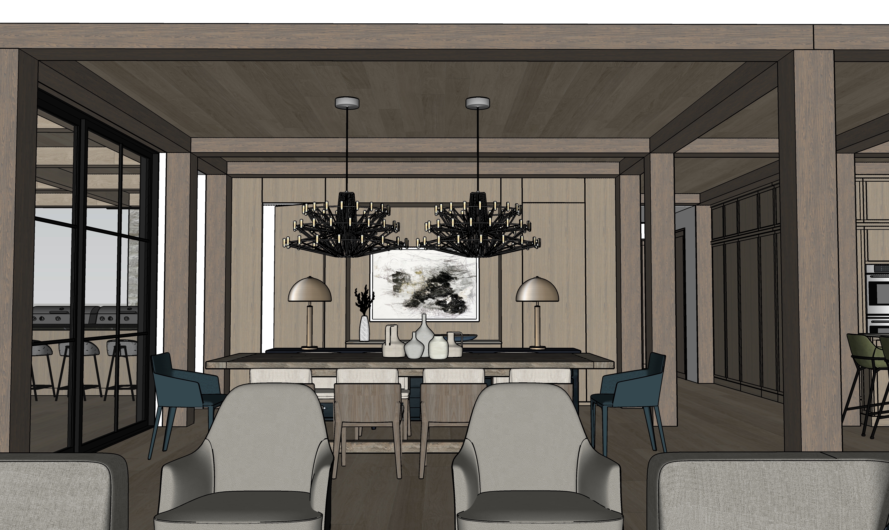 luxurious and refined dining room with soft sunlight and natural light in the kitchen at right of the image