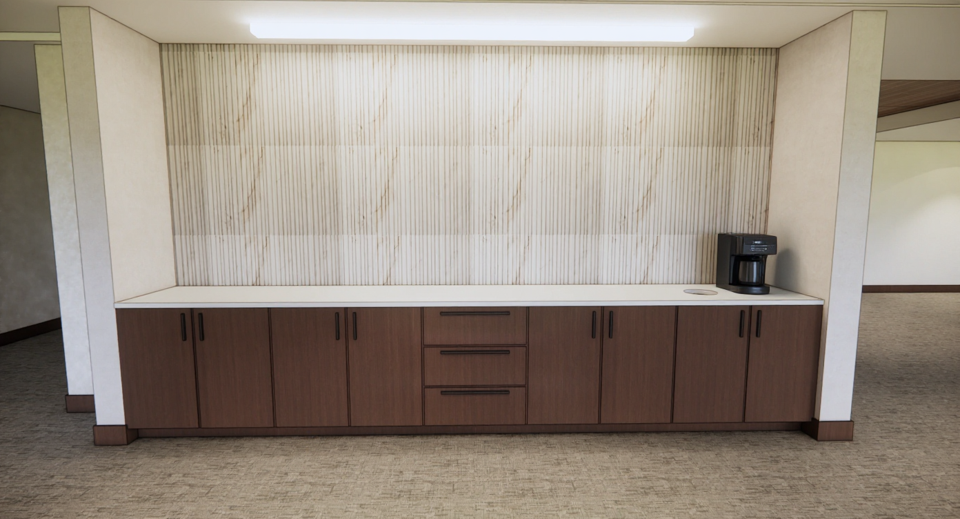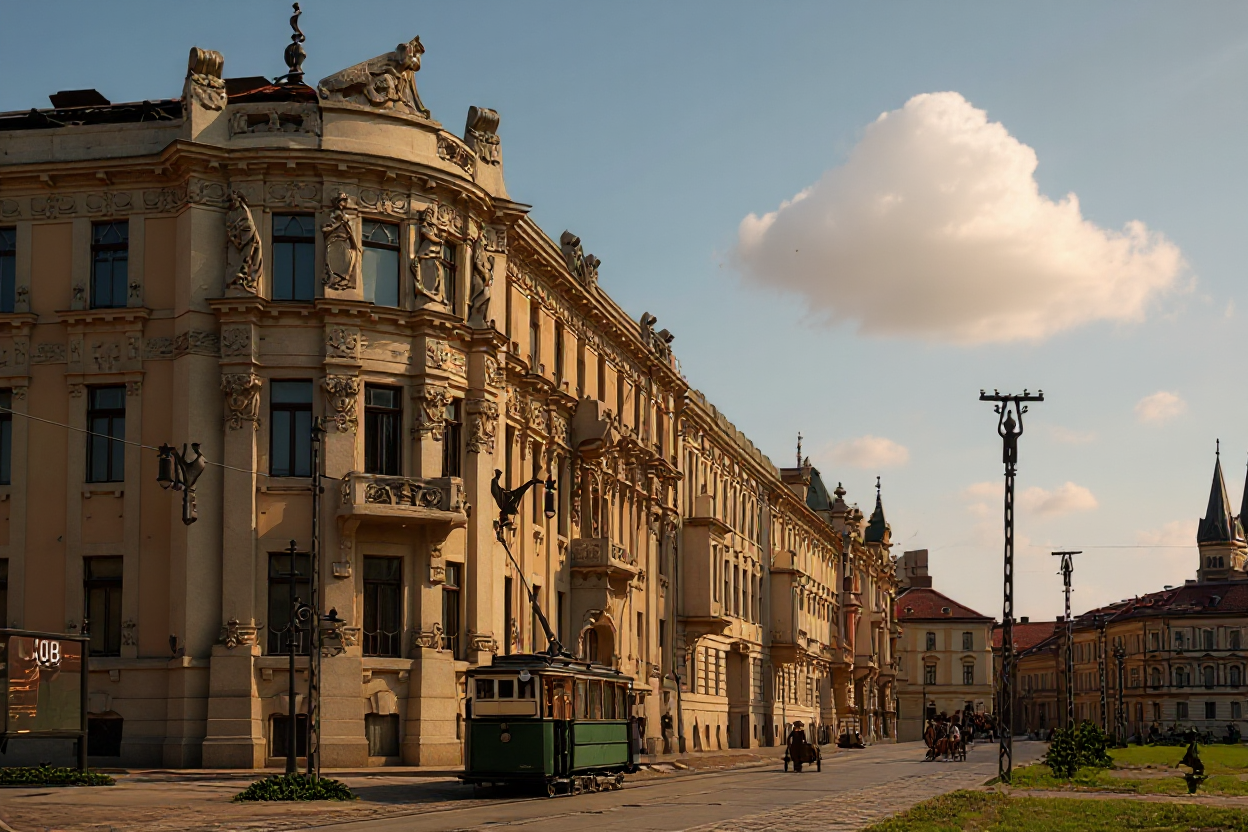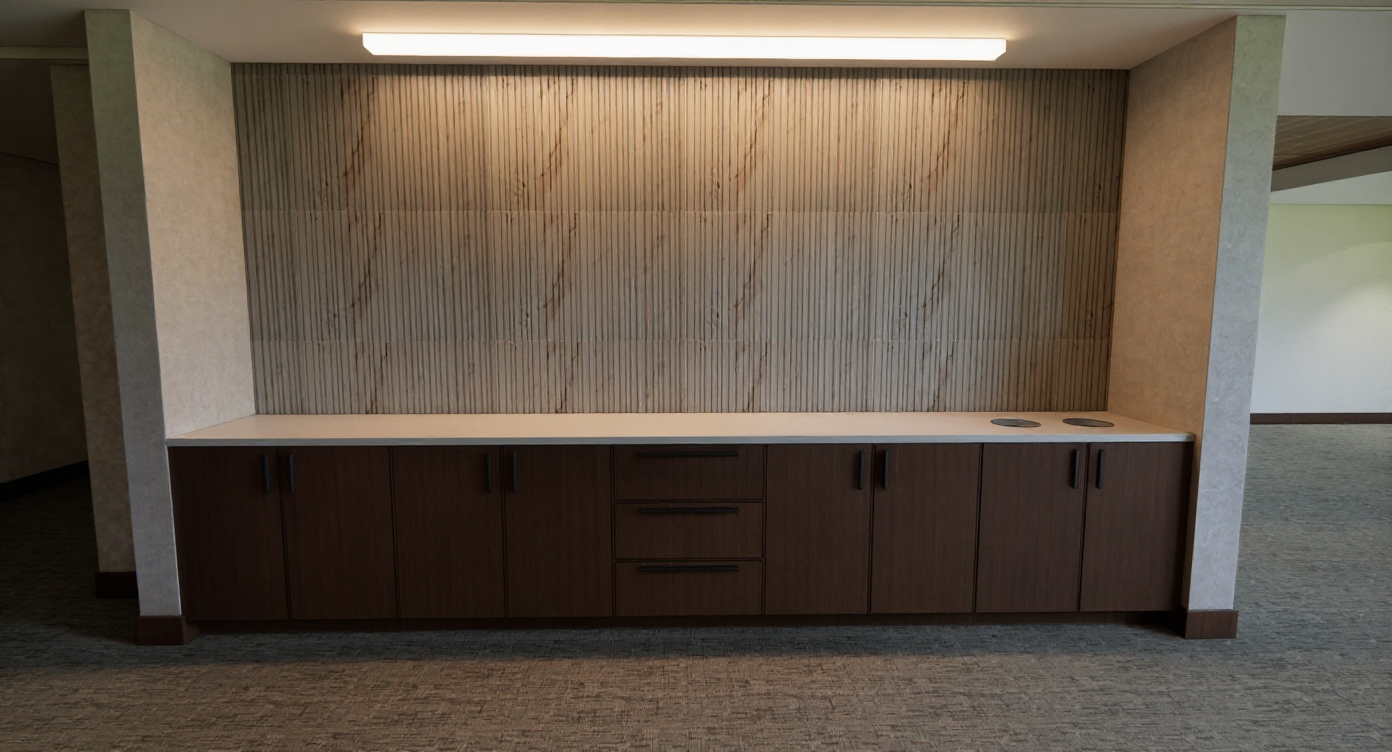luxurious and refined dining room with soft sunlight and natural light in the kitchen at right of the image