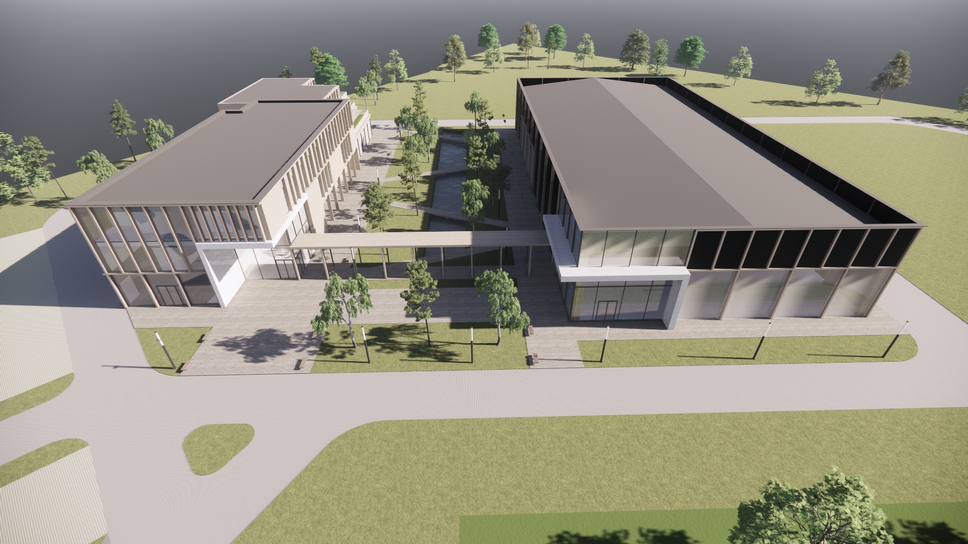 minimalism exterior shot zr b foto realistyczn wizualizacj w otoczeniu lasu mieszanego na elewacji u yj nast puj cych materia w w miejscach gdzie jest faktura drewna u yj drewno naturalne z pionowym us ojeniem lub pionowym podzia em faktura jasnego betonu beton architektoniczny dla budynku hali u yj materia w kolor grafitowy to p yta warstwowa antracytowa pionowe s upki i elementy na elewacji o fakturze drewna u yj drewno naturalne z pionowym us ojeniem witryny szklane z s upkami w fasadach kolor antracytowy otoczenie u yj naturalnego otoczenia traw mog by te trawy ozdobne nawierzchnia z kostki betonowej u o onej w jode k parkingi z kostki a urowej z traw w wype nieniu nie zmieniaj architektury i uk adu dr g woda naturalny kana zbiornik wodny wok kana u mog by trawy ozdobne lub naturalne trawy wzd u kana u dodaj drzewa brzozy architecture