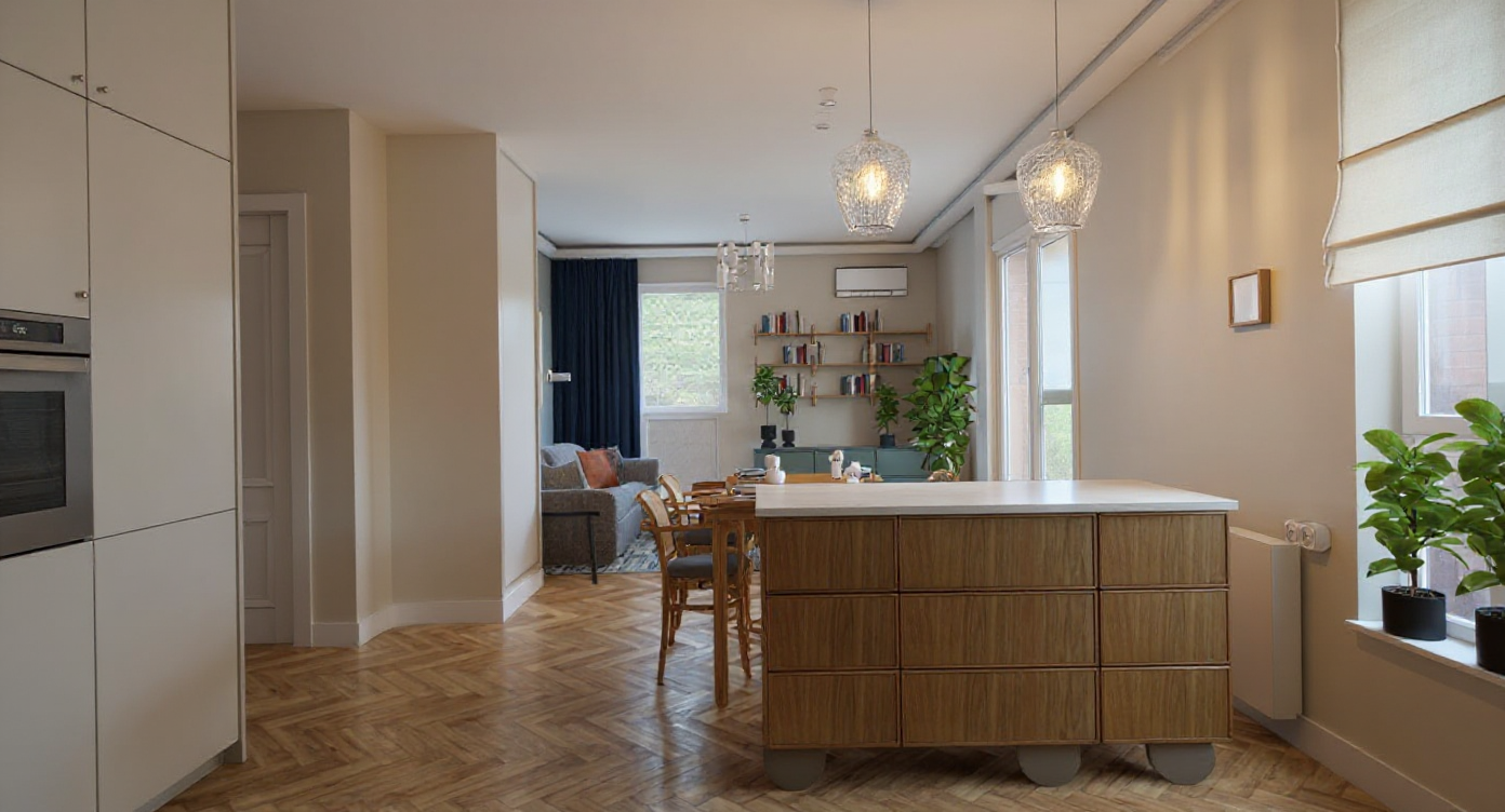 a realistic scene showing the project buildings integrated into an open railway landscape several railway tracks run horizontally across the lower foreground of the image parallel to the front edge of the scene the tracks lie in front of both the new buildings and the existing brick signal tower around the tracks there are areas of tall grass shrubs and scattered young trees creating a slightly overgrown railway environment behind the buildings the surroundings consist of open green spaces and light industrial structures in the distance under a bright sky with soft clouds architecture