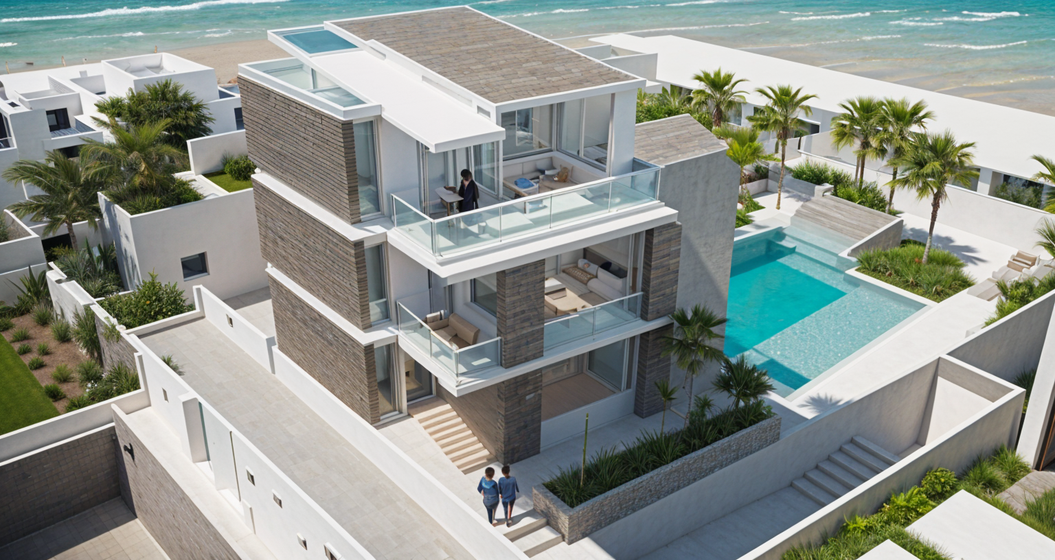high tech aerial shot a modern architectural house in the mountains render in detailed high definition large modern windows with modern light brown wood exterior finish a small courtyard with coastal plants palm trees with vibrant green leaves and slender brown trunks lining pathways small geometric structures in light gray sit elegantly nearby below abstract art decorates a sleek lounge with minimalistic white and black furniture the atmosphere is calm and rejuvenating bathed in soft morning sunlight architecture