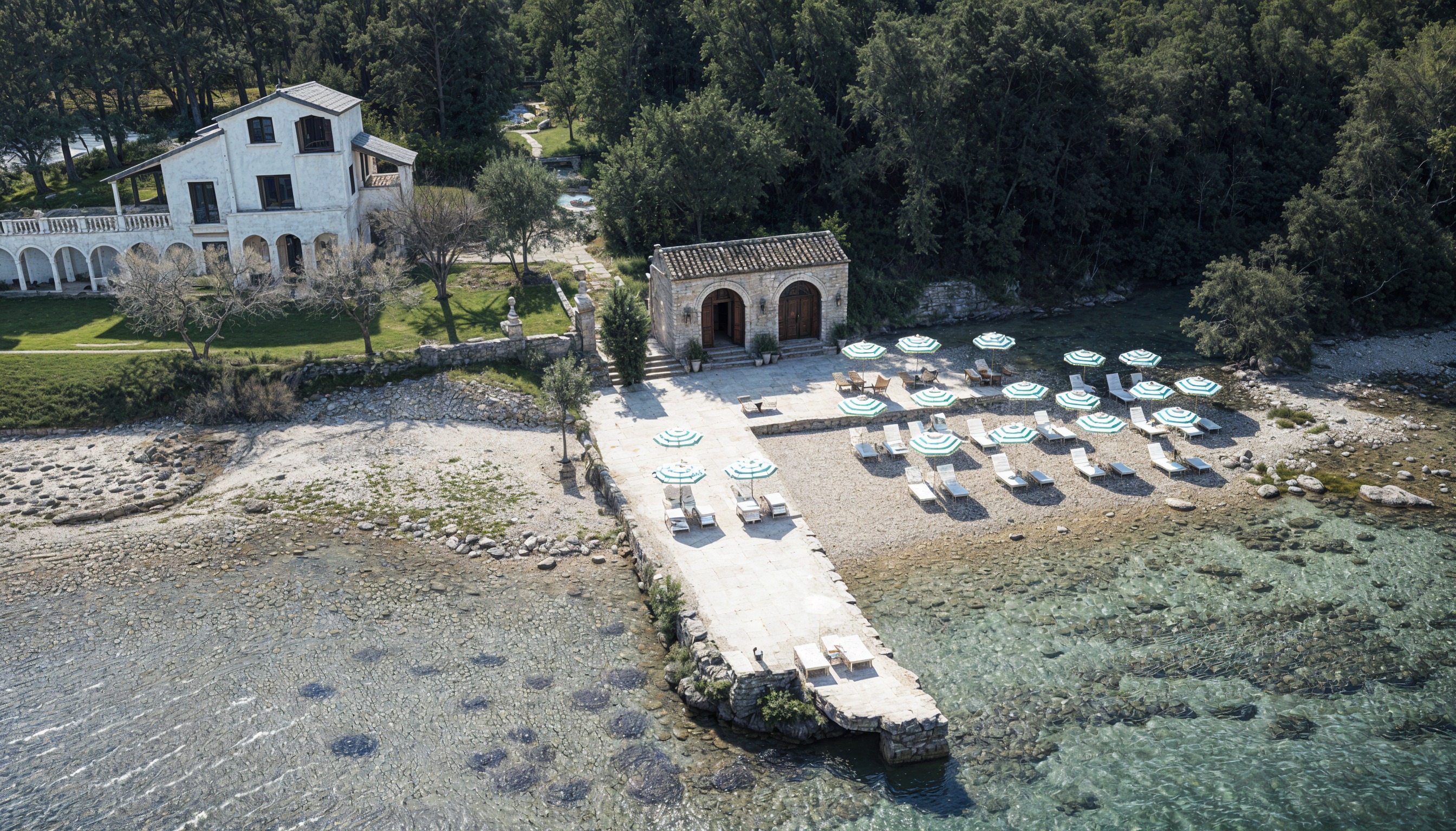 please remove the first row of sunbeds the ones closest tothe water 4 of them keep the rest remove the sunbeds from the furthest point of the dock and ad sunbeds only on the right side of the dock remove the plant in front of the stairs on the left of the small building in front of the building put a sun cover that will be attached to the smaller building coming out of it s walls under which there will be 4 coffee tables this is mandatory put people on the sunbeds and coffee tables enjoying their summer vacation make the roof of the smaller building nicer keep it in tiles and make it slightly red color and newer but with an old feel add sunblocks over the sunbeds round sunblocks in two colors white and tourqoise the vibe needs to be mediterranean