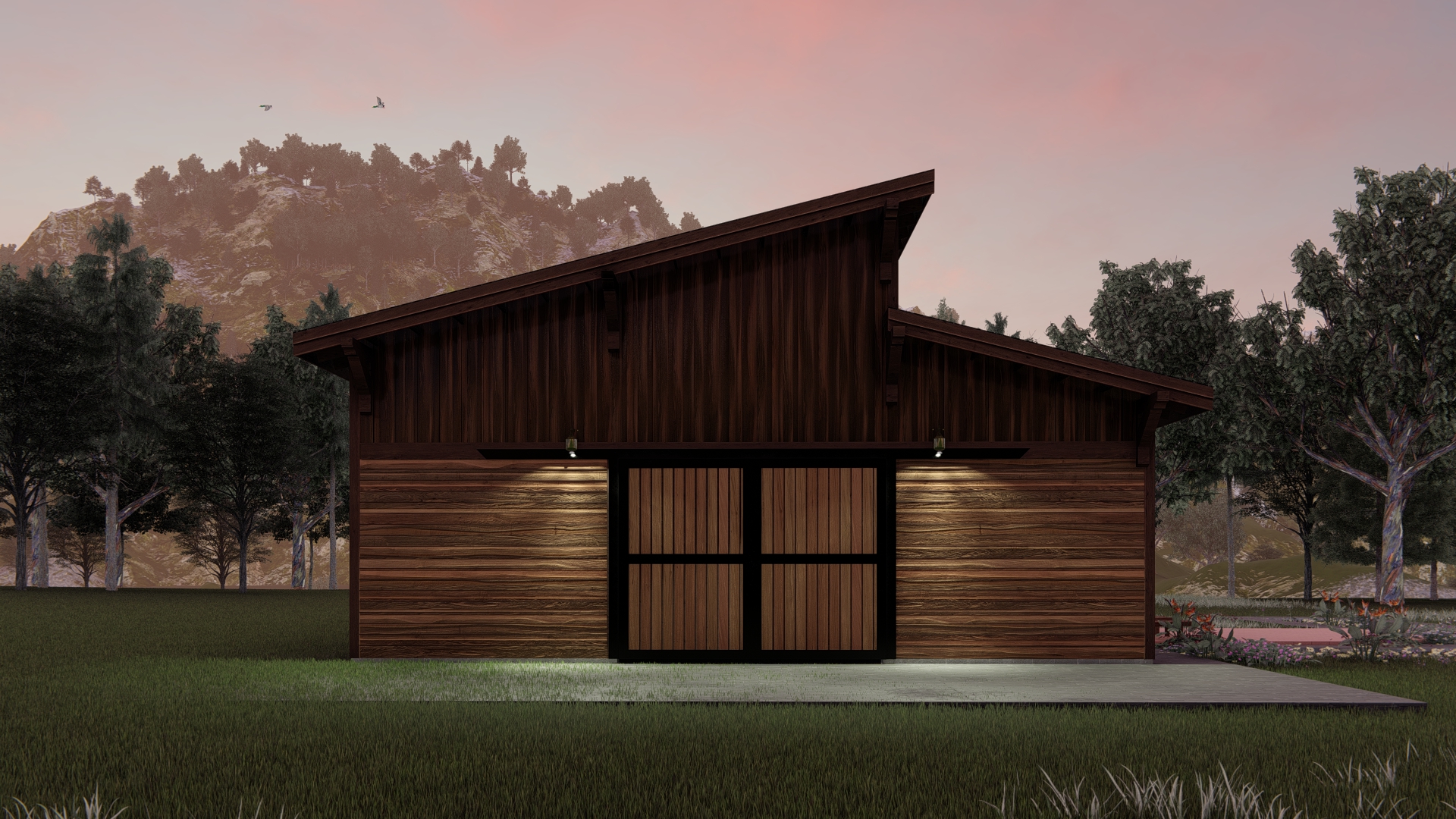 clean architectural exterior rendered in cinematic daylight lighting warm cedar siding on the bottom portion of the structure cedar wood barn doors with black trim black metal standing seam roof forrest in the background soft daylight landscape with blue skies glass reflections on the windows natural wood textures high fidelity photorealistic visualization crisp shadow falloff refined fa ade geometry richly detailed grain patterns soft atmospheric depth calm minimal landscaping premium architectural photography mood ultra clean composition and materials