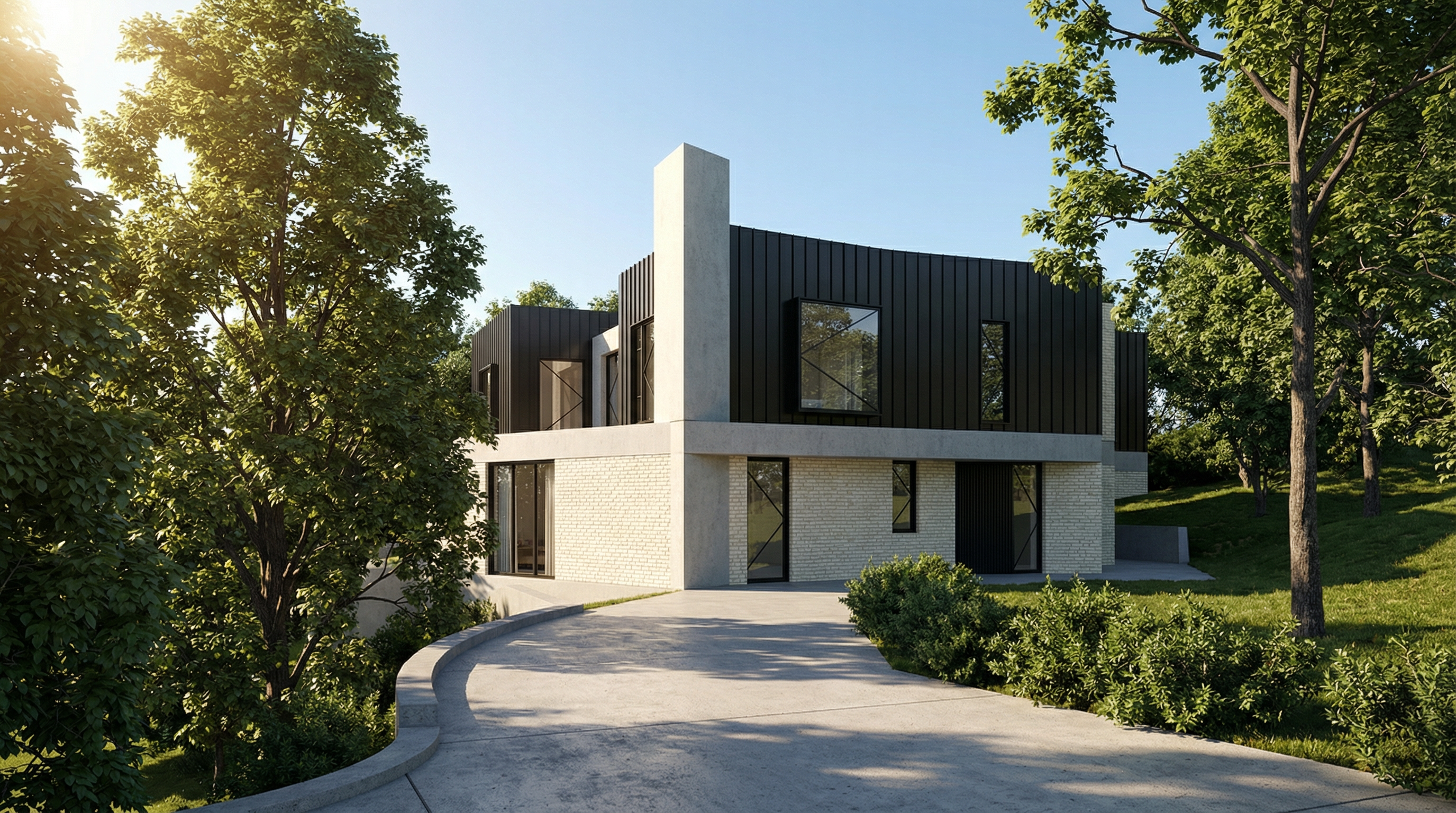 create a photo realistic visual of this the ground floor material is a slight cream white brick with a light mortar the band aroud the middle is a light grey concrete and the black cladding is vertical black standing seam all windows are black frame make it look classy and realistic dont change the proportions of the image