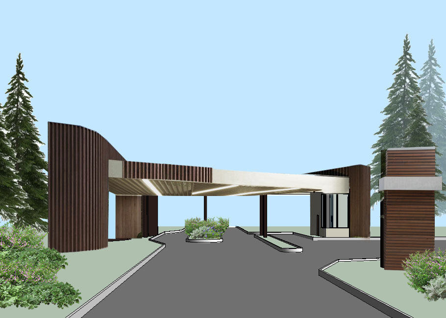 modernist exterior shot entrance for cars to the settlement architecture