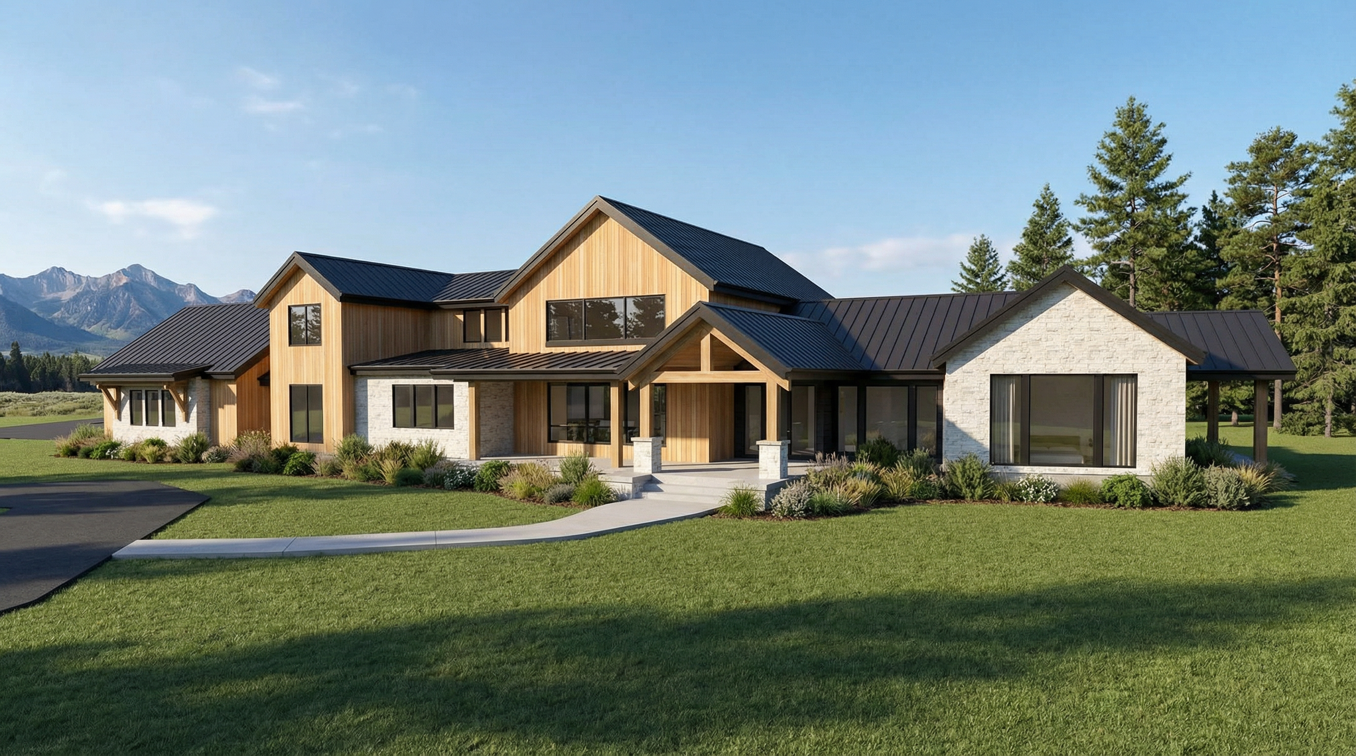 enhance the realism of the existing architectural design while maintaining the same materials and textures focus on realistic lighting shadows and surface details to create a lifelike appearance ensure the mixture of wood siding is preserved in the correct areas making them look authentic and cohesive this is in montana add montana landscape but nice landscaping near the house dont change the shape of the driveway add montana vegetation around house make wood siding modern vertical 10 wider plank siding natural cedar light warm honey tone clear matte finish clean sharp edges minimal knots contemporary scandinavian farmhouse style high end residential exterior the siding is not board and batten it is wide planks with realistic wood grain texture make the planks about as wide as the front porch post make rock a light white color do not change the driveway or the sidewalk do not add chimney do pine trees to the right and behind house to the left add mountains far off in distance
