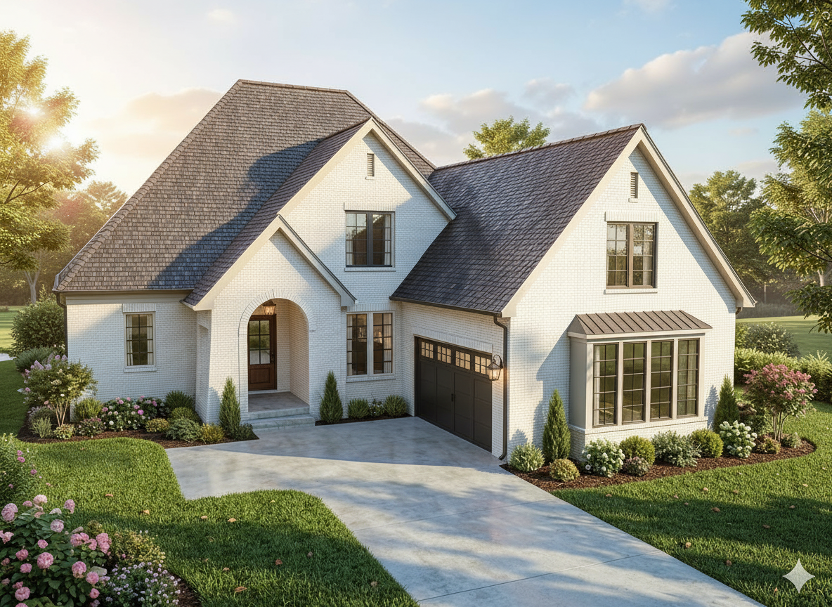 fai esterni moderni con intonaci color tortora chiaro infissi e basculante garage color avorio moderni pavimentazioni esterne in porfido a lastre colori delle terre lattonerie in rame e copertura in coppi di laterizio tipo invecchiati oltre ad un giardino frontistante l ingresso con aiuole disegnate con linee geometriche regolari e minimal con piante basse e grasse ma molto scenografiche aggiungi nella parete sotto la loggia un rivestimento in lastre di pietra a strisce di cm 10 circa di altezza con posa a correre di colore avorio con texture omogenea anche la pietra della torretta di color avorio nel giardino oltra lle aiuole tutto il resto a prato aggiungi qualche ulivo