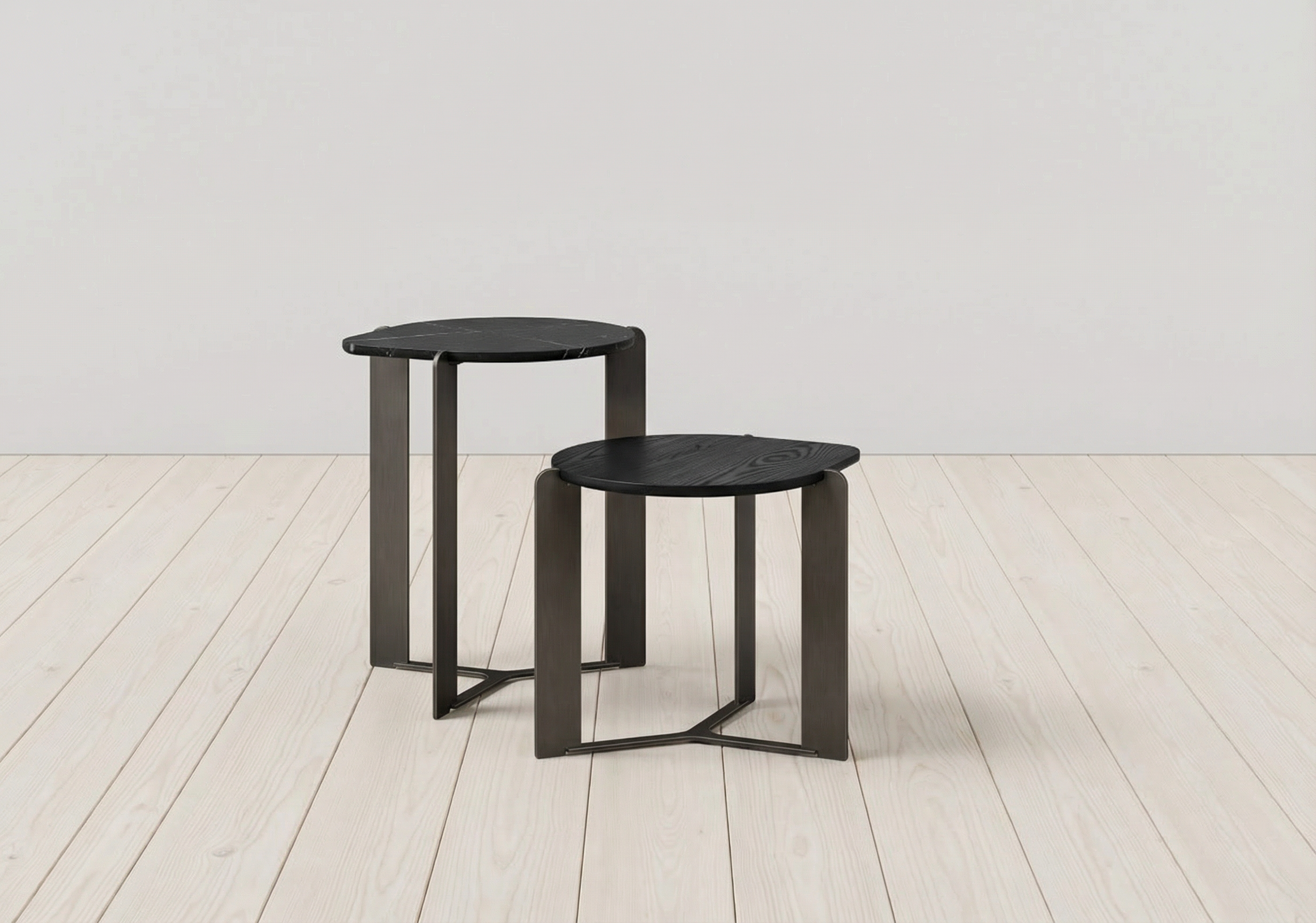 make one of the table tops subtle black marble and make the other table top white ash that has a black wood finish on it that still allows the wood grain to show through leave the legs as gunmetal steel put them on hardwood floors that are very light in stain and have narrow boards that run parallel to the wall