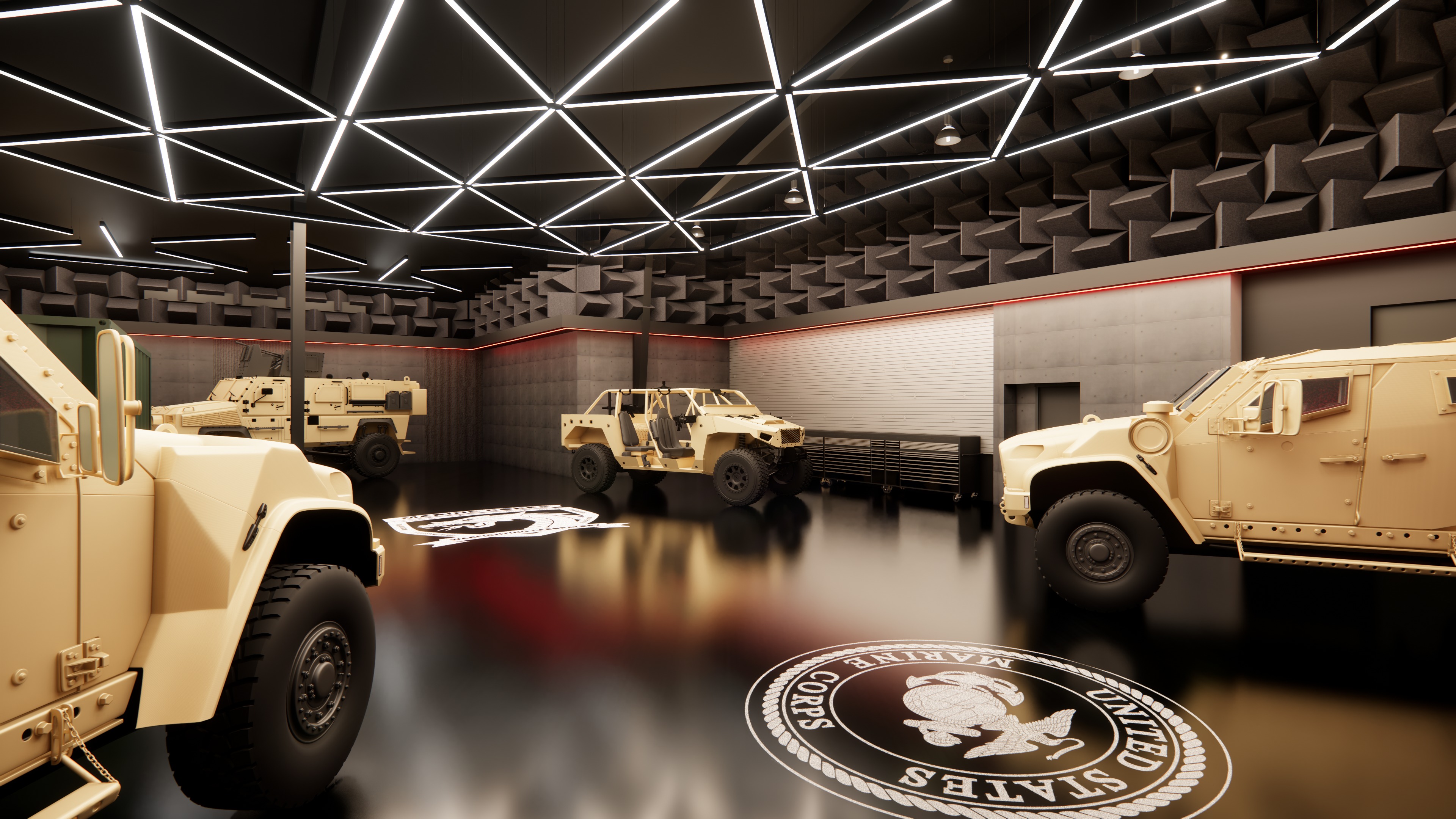 keep original image as is do not change image add people in business suits add high ranking marines dress in green service alpha suits without hats add tools to the white slat wall in the middle of the image