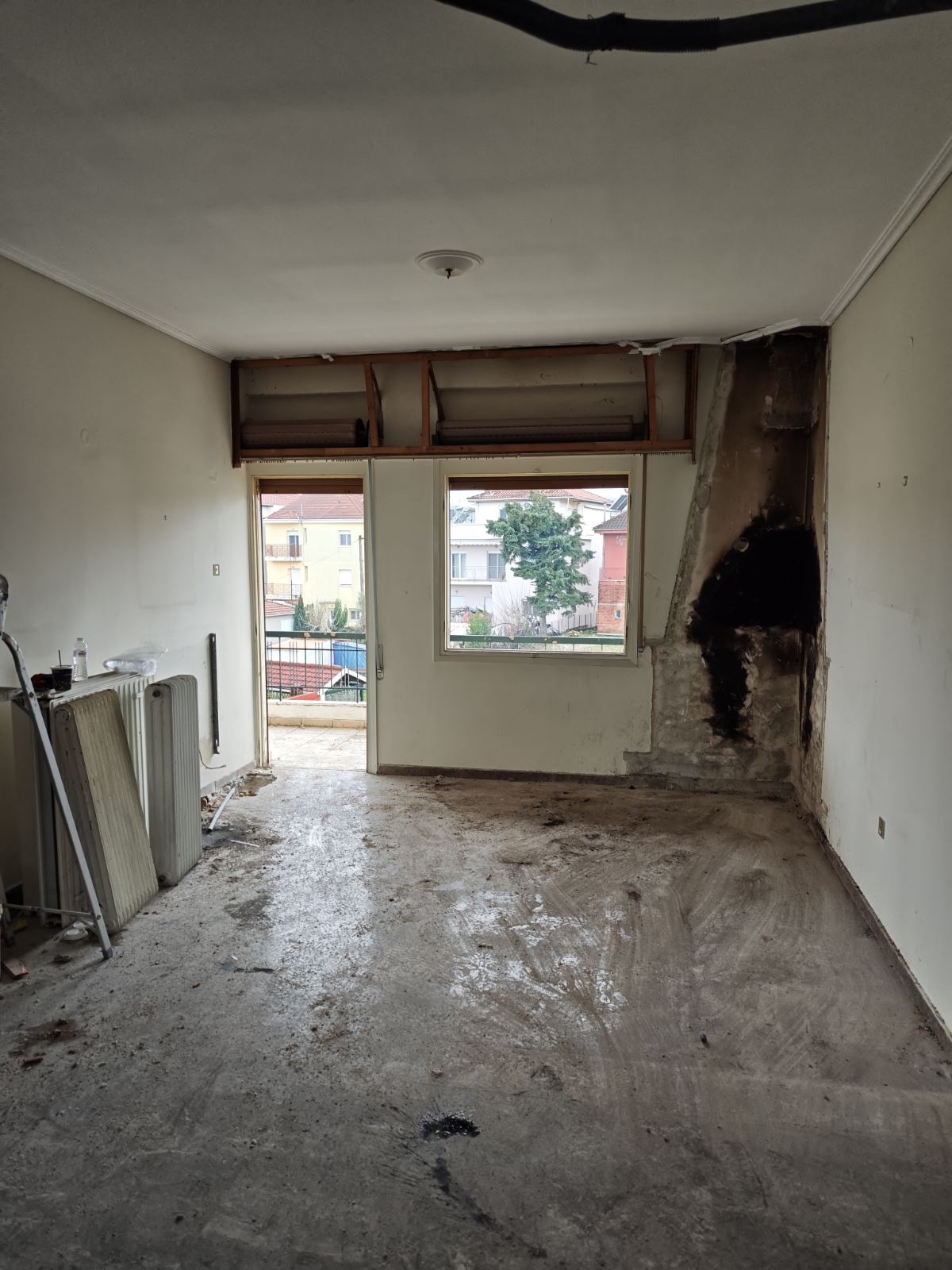 transform the room into a cozy modern living space with soft neutral tones the walls are painted a warm beige complemented by cream colored crown molding the hardwood floor has a rich walnut finish add a large plush area rug in soft gray and white geometric patterns the window features sheer white drapes that allow natural light to flow in softly install a built in bookshelf on the wall filled with neatly arranged books and decorative items place a comfortable light gray sofa with colorful throw pillows in shades of teal mustard and coral include potted green plants by the window for a touch of nature the atmosphere is peaceful and inviting with a subtle glow from modern pendant lights above
