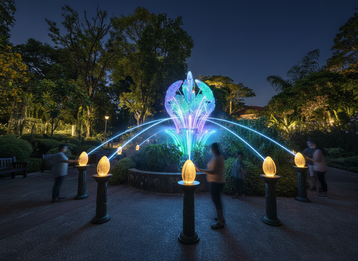 a render of a night installation at the singapore national orchid gardens in the middle fountain theres a large abstract water light fountain at the top around the circumference are seeds pedestals that glow when people touch the seeds the orb in the middle sends flowing pulses of water to the seed