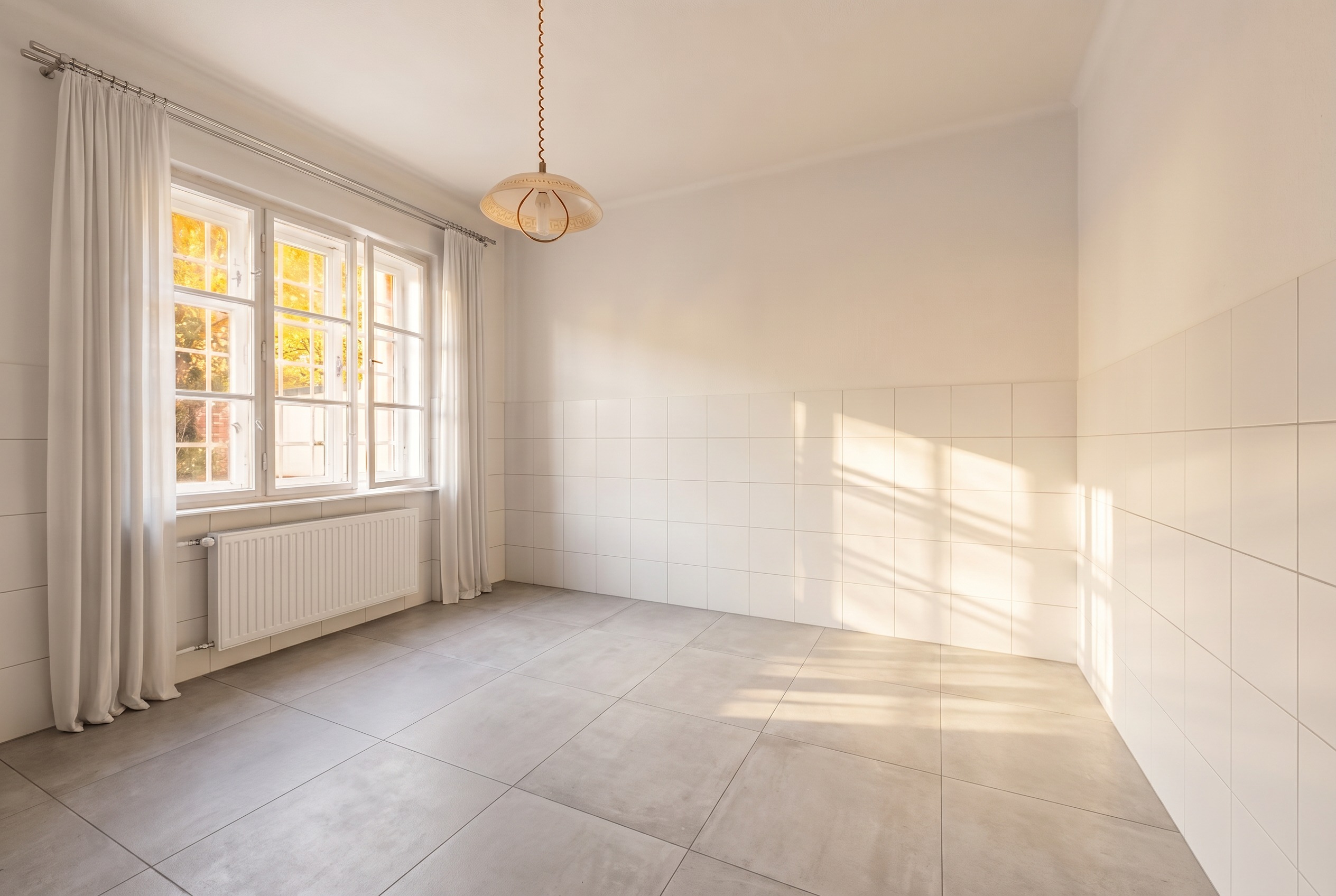 odstra obklady na st n vlevo za z v sem vykresli hladkou pr svitnou z clonu spl vavou p es radi tor vykresli velk modern kruhov sv tidlo zav en pod stropem p mo u okna vykresli modern j deln st l se 6 celo aloun n mi idlemi v barv b l