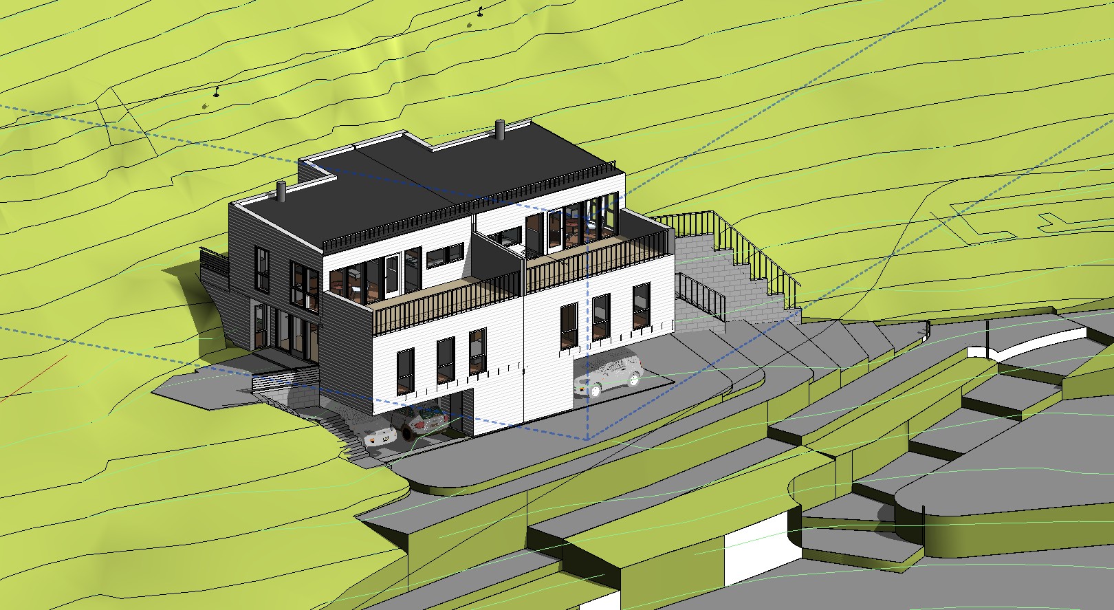minimalism exterior shot a rendering of a 3 story duplex with dark brown oil based pain of siding og layingng down siding glass balustrade the setting is in a nature environment and soft natural daylight illuminating the structure lush green landscaping frames the perimeter adding a touch of nature to the scene architecture