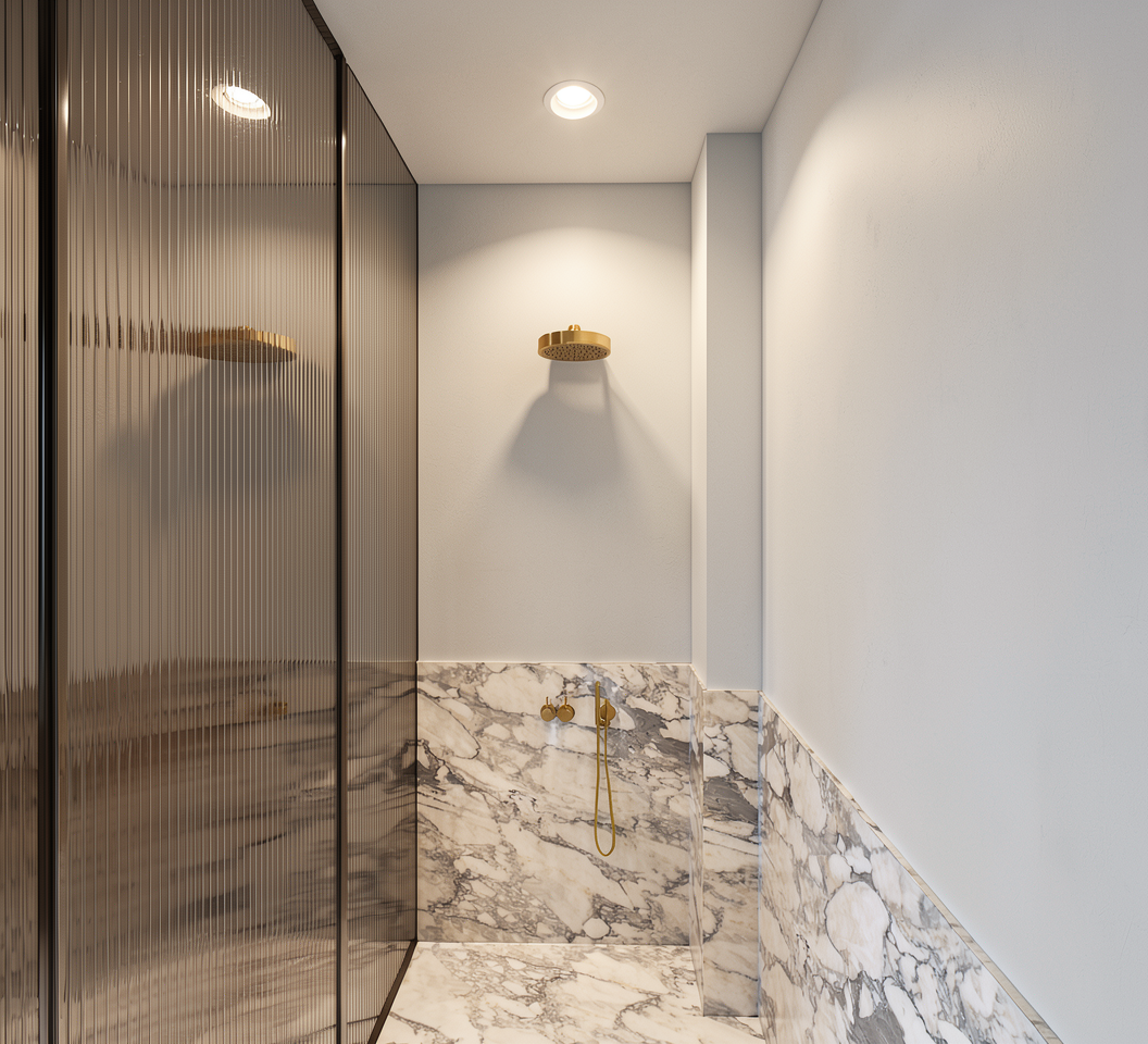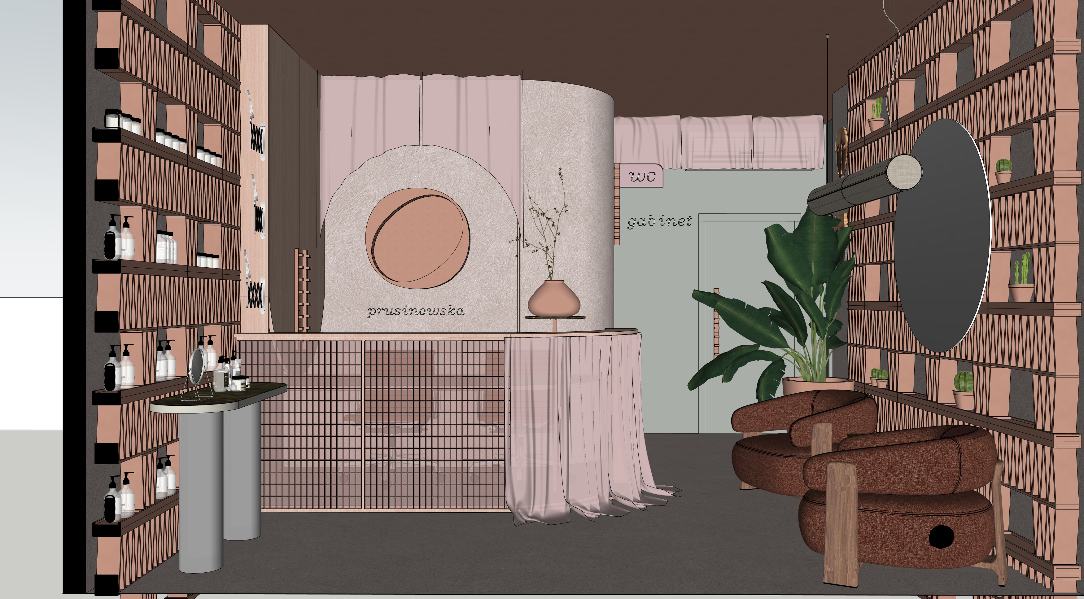 description for ai a highly detailed photorealistic cgi render of a combined cosmetic boutique and treatment room interior presented in a direct one point perspective looking straight at the central service counter the color palette consists of muted terracotta powder pink muted sage green light natural wood and dark gray with a smooth chocolate brown ceiling the entire left wall is occupied by a dense shelving structure made of pink terracotta bricks holding precise rows of cosmetic bottles with white labels below these main shelves is a smaller counter with a light natural wood top on cylindrical legs the central service counter features a front made of pink glass blocks on top of the counter is a terracotta vase with dried branches and a soft powder pink draped linen curtain hangs rising behind the counter is a carved arch made of translucent backlit fabric featuring a central terracotta circular logo with the text prusinowska in elegant script surrounded by a rough plaster wall powder pink curtains hang above and beside the arch the rear wall is muted sage green textured plaster it features a door with a sage green panel and a simple light wood handle above the door is the text gabinet in script and above that a small wc sign the right wall has matching shelves with cosmetics cacti and other items it features a large round brown mirror above the mirror is a cylindrical linen fabric light fixture gently diffusing warm light in the foreground to the right two sculptural armchairs stand upholstered in terracotta textured fabric with thick dark wood cylindrical armrests behind them is a large potted monstera plant in a terracotta pot the floor is beige concrete and the ceiling is smooth chocolate brown the lighting is soft and diffused highlighting all material textures the atmosphere is natural warm and highly realistic all text is correctly rendered and spelled prusinowska gabinet wc
