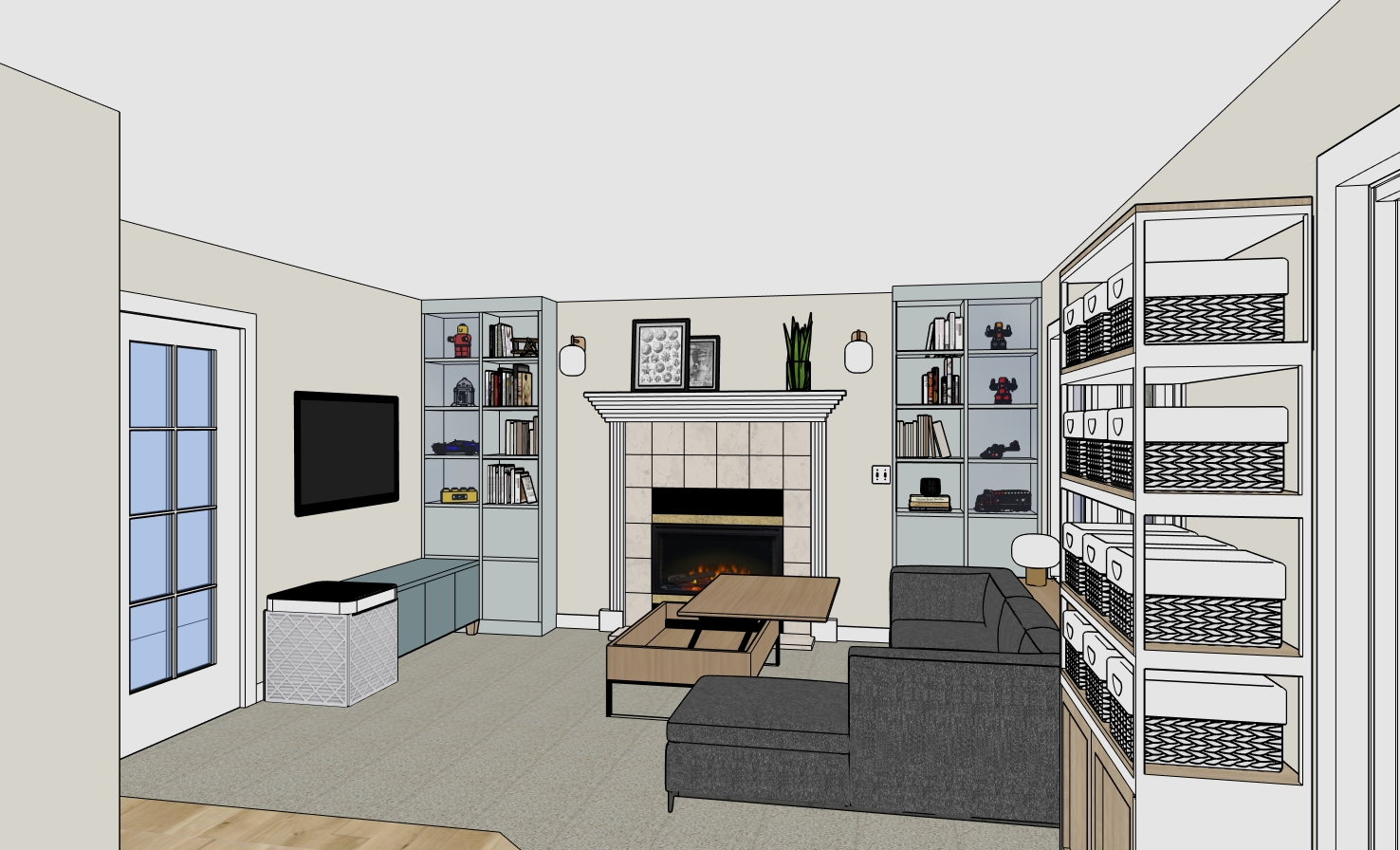 render a cozy and modern living room with a warm inviting atmosphere the walls are painted in a pastel blue color complemented by pastel blue built in shelves filled with books and decor items like lego figurines the fireplace is elegant with a beige tile surround the sofa is a light gray color for a contemporary look paired with a wooden lift top coffee table in a natural oak finish add a light gray woven basket for storage and place a rich green snake plant on the mantel for a touch of nature the carpet is a subtle gray beige blend and natural wood flooring contrasts beautifully with the room s color palette the wall lights have a soft warm glow enhancing the cozy ambiance the atmosphere is serene and welcoming perfect for relaxation and warmth