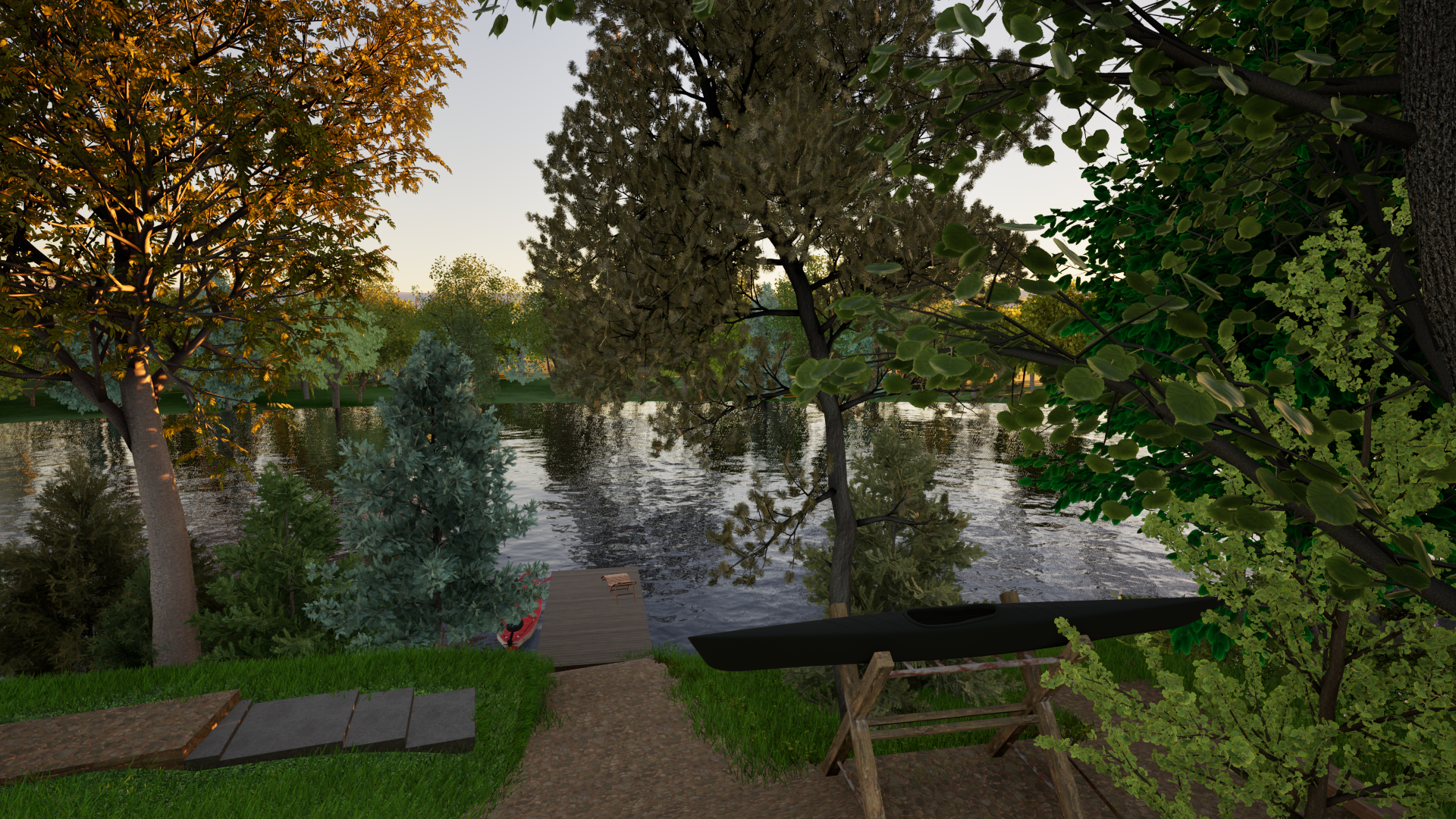 a manicured lawn layered flower beds low maintenance shrubs native plants stone pathway leading to the water dock