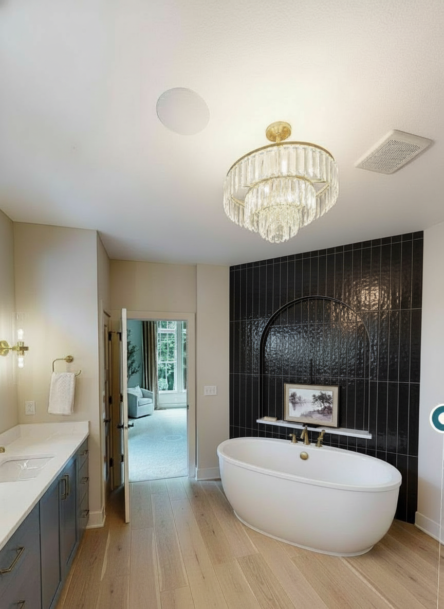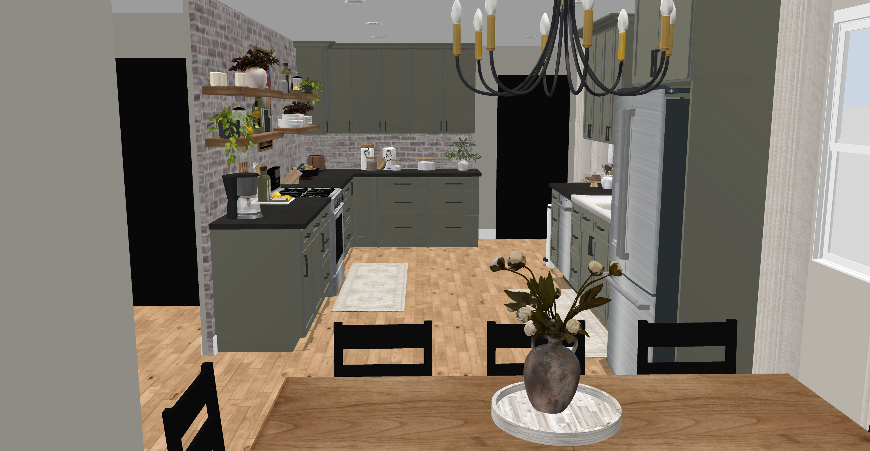create a photorealistic image of this kitchen keep everything exactly where it is except put a wood range hood vent above the range that goes to the ceiling