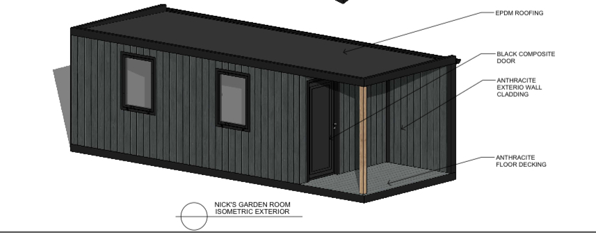 transform this garden room into an ultra luxury architectural visualization contemporary garden pavilion with deep anthracite vertical cladding matte black aluminium trims and expansive frameless glazing add a statement covered entrance with warm natural timber post detail and seamless threshold surroundings high end landscaped garden with porcelain patio slabs architectural planting sculpted lawn edges and mature trees creating a private luxury setting lighting cinematic late evening golden hour transitioning to dusk dramatic directional light with long soft shadows warm interior ambient glow visible through glass subtle reflections and contrast for depth materials ultra realistic textures charred timber grain brushed aluminium reflective architectural glass smooth concrete premium decking finish mood bold sophisticated architectural magazine quality luxury lifestyle aesthetic camera slightly low perspective hero shot 35mm lens shallow depth of field cinematic composition rendering quality global illumination hdr lighting realistic reflections ambient occlusion ultra photorealistic detail avoid flat lighting dull materials cgi look cartoon style over brightness optional luxury enhancers add if supported add one or two for extra wow factor exterior integrated led strip lighting under roof fascia designer outdoor lounge furniture fire bowl or sculptural feature floating step entrance with concealed lightin yes keep this style and shapr now align the windows and doors to be idential to the upload