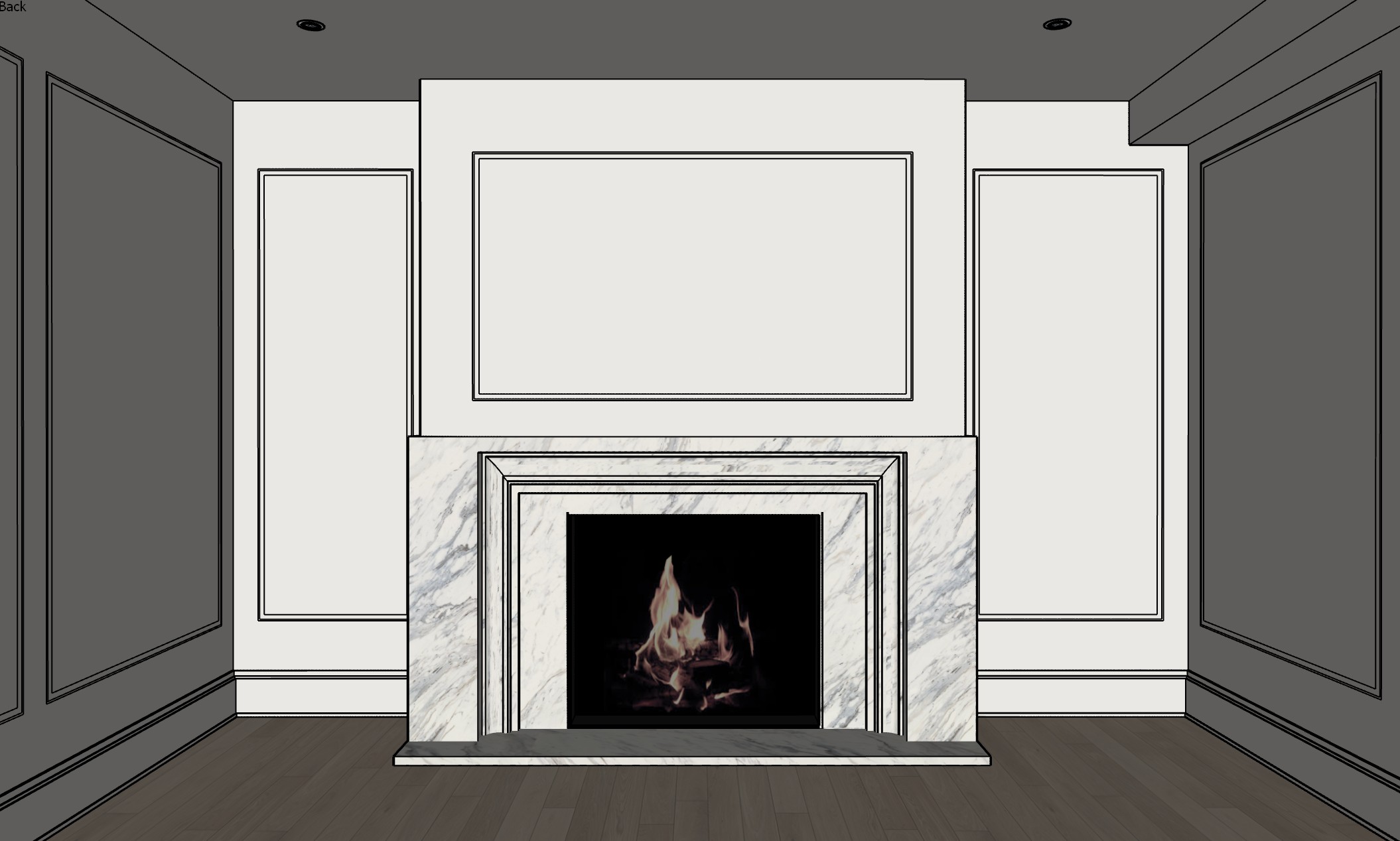 all the walls and ceiling a a soft creamy off white the floor is white oak beige add some glass screen protector in front of the fireplace mantle