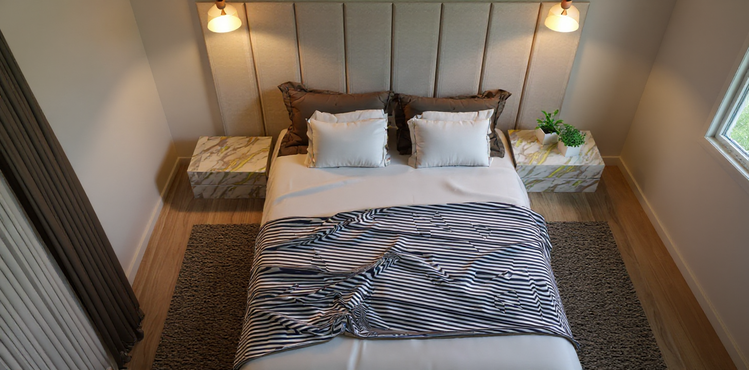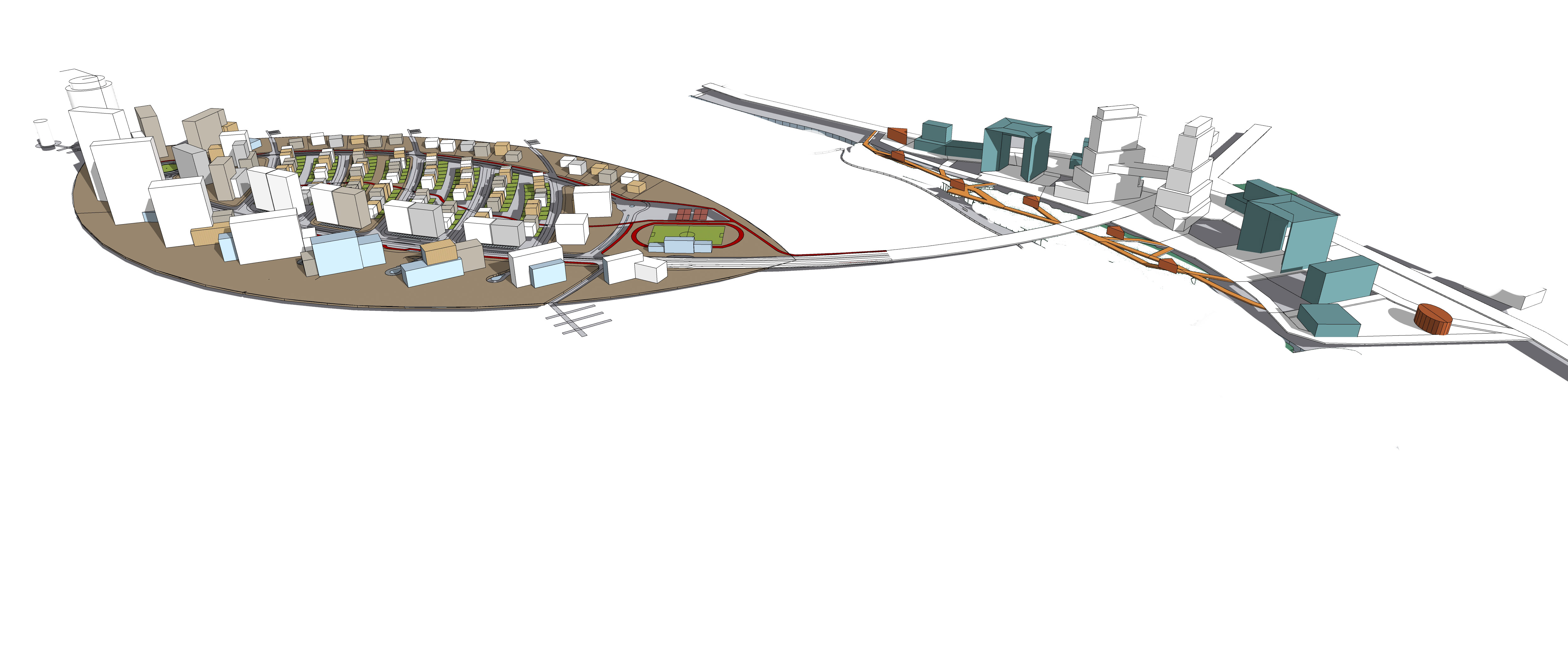 respect the volumetry exactly as it is do not create or modify the background as it will be added later in photoshop on the left side we see an island similar to dubai but on a smaller scale with approximately 20 story residential and hotel buildings on the right side we see a development of modern glass clad office and hotel towers maintain the exact scale proportions and composition of the input image