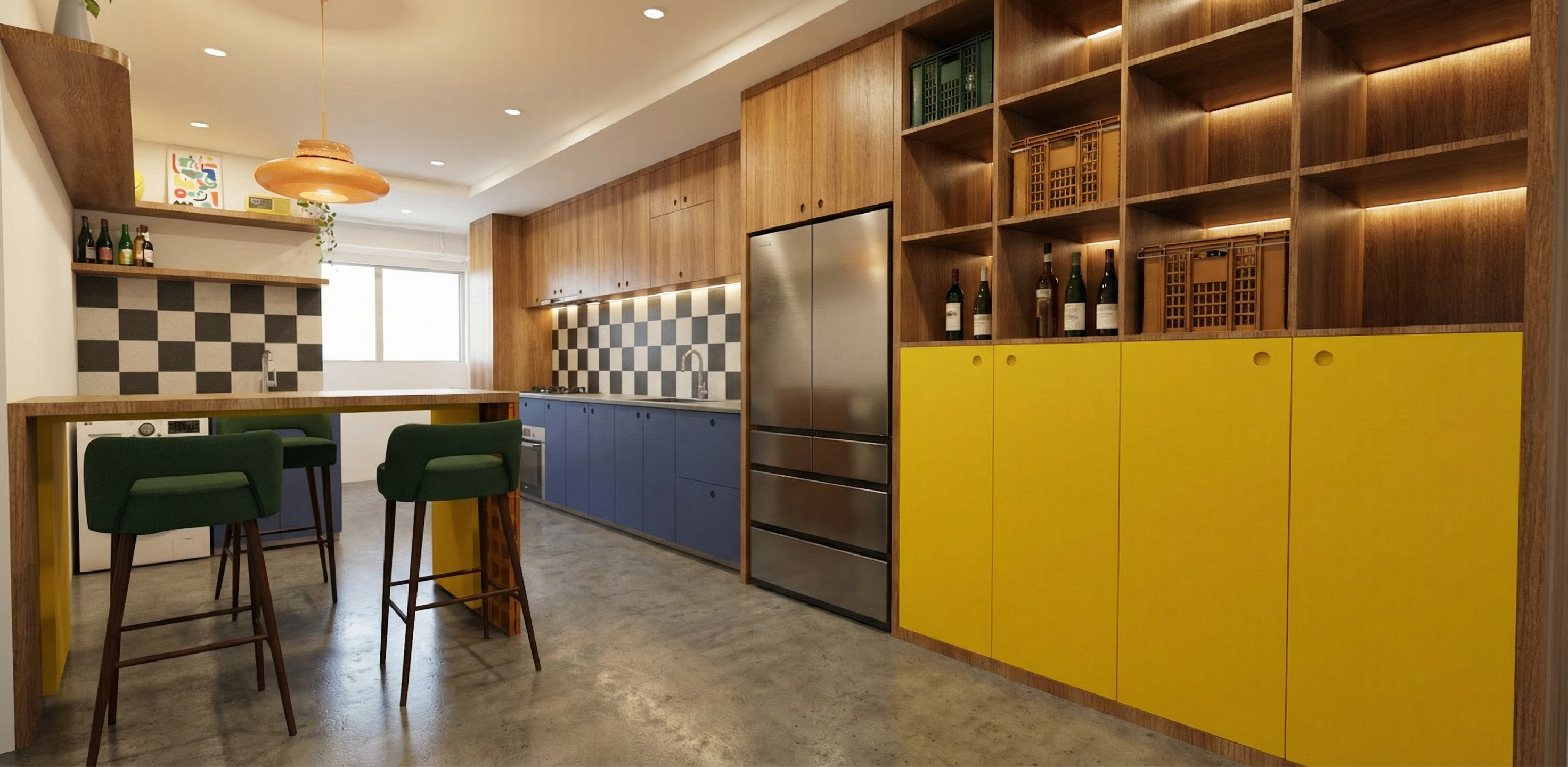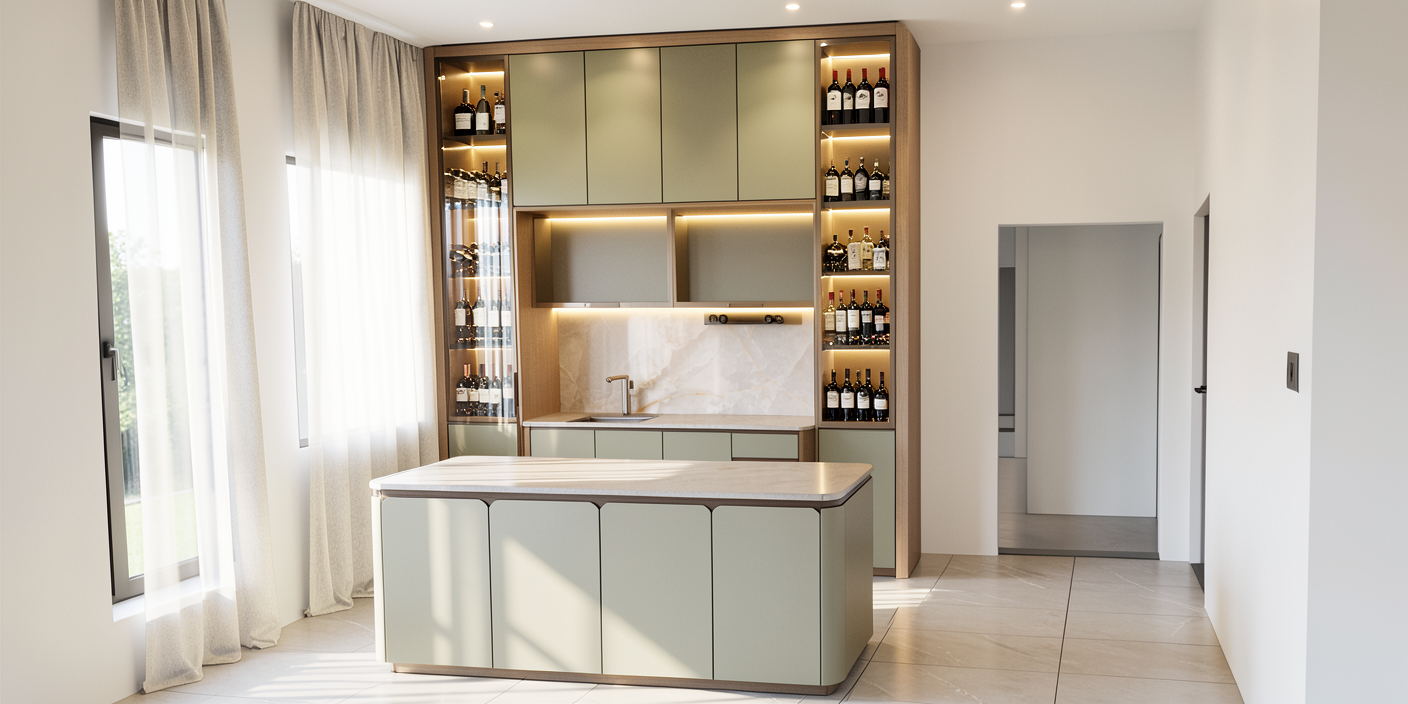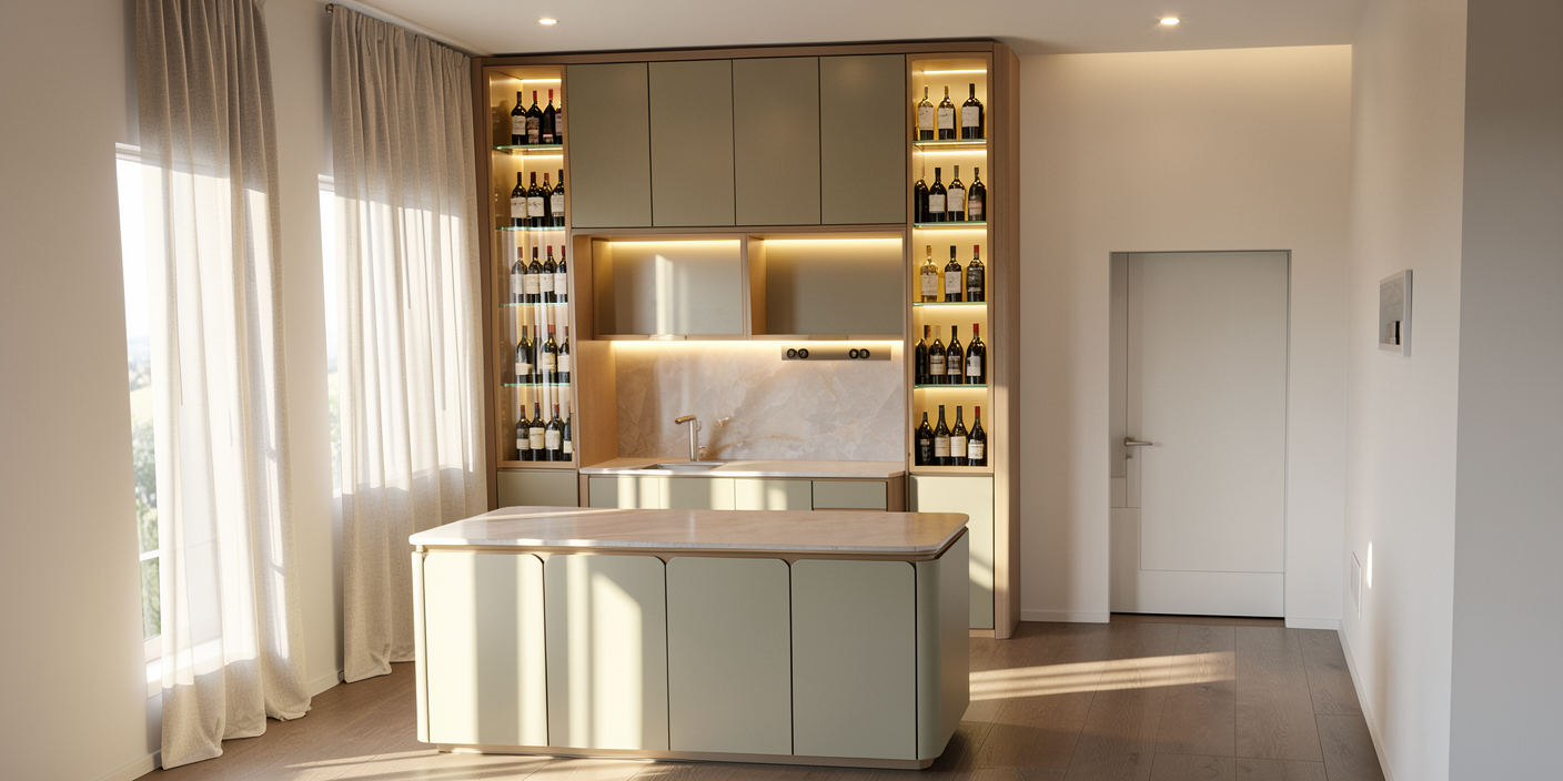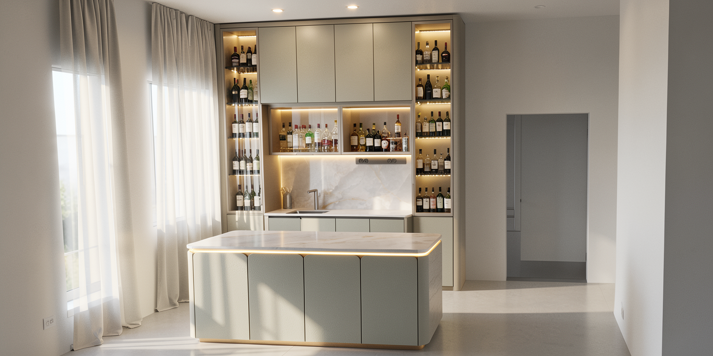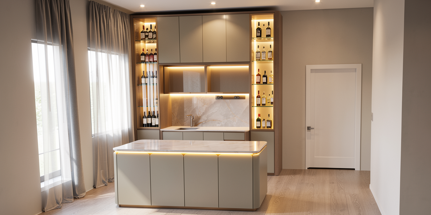 additional spot down light on ceiling bright up the space day sun light from outside top bottom island cabinet with led strip display cabinet with some wine liquors