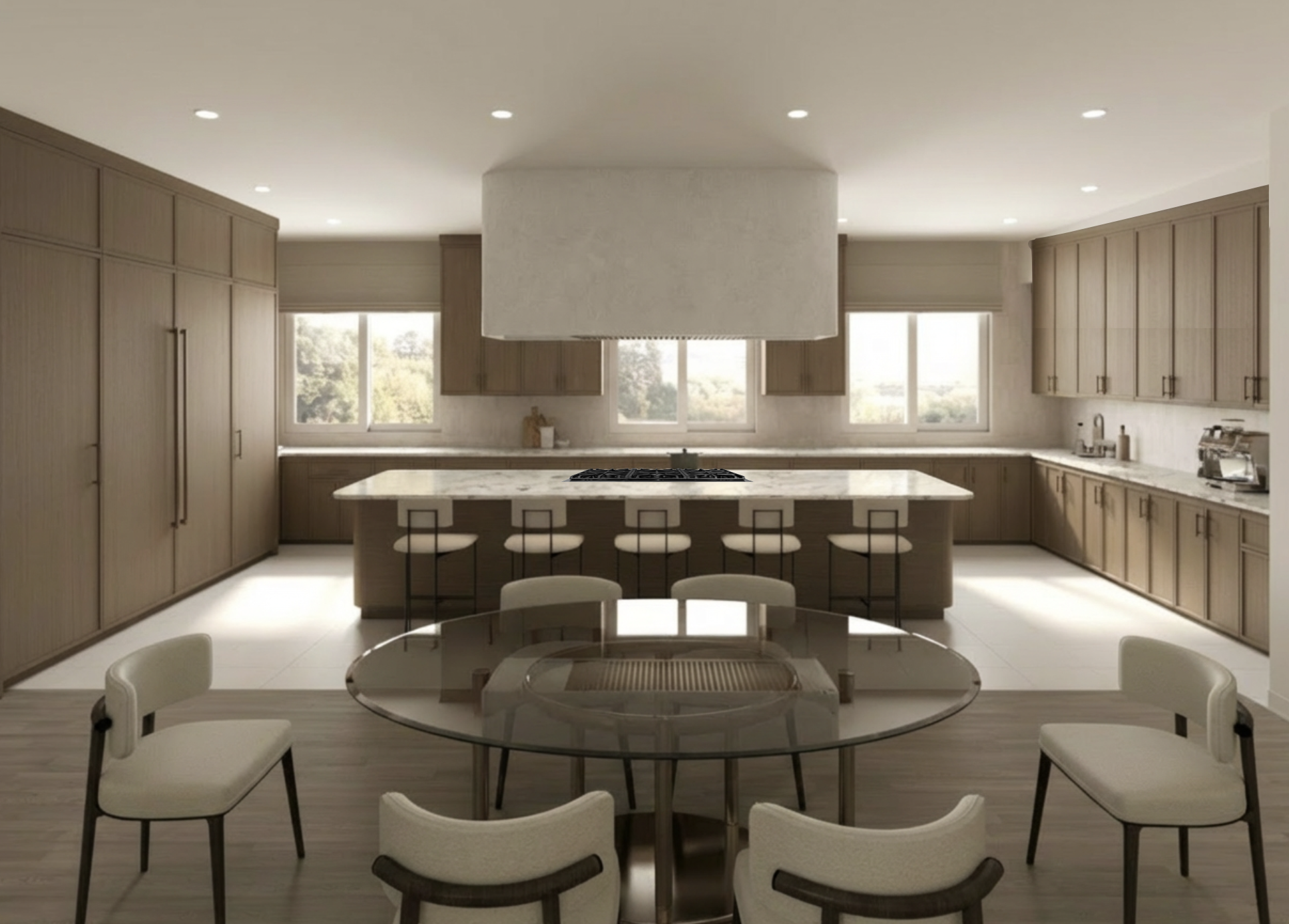 add double wall oven to left side wall left of the walnut paneled fridge and freezer