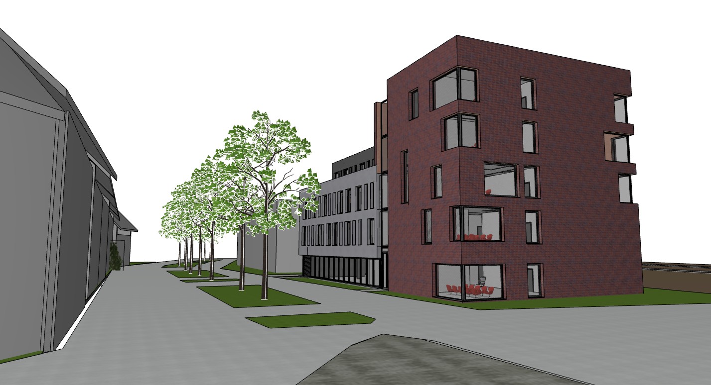 please leave the facade in dark red brick the rear part of the building in grey plaster and the surrounding area grey architecture