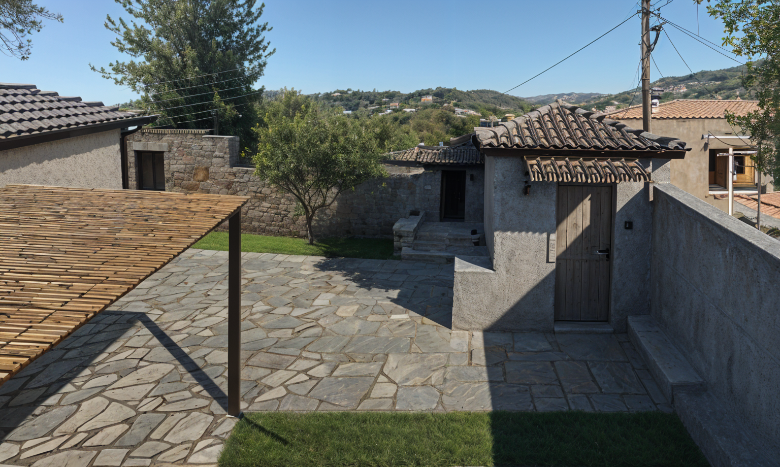behind staris is glass and nature landscape like grass meadow and little trees add seatin material like outdoor furniture has longe