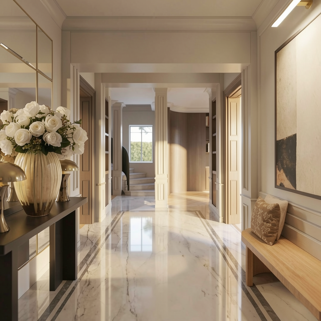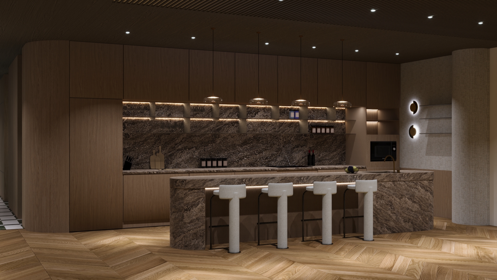 modernist exterior shot improve materials texture make it realistic but keep colors and patterns the same add fabric texture to white stools make the image photorealistic high resolution keep all elements and colors the same keep image environment as it is keep same lighting keep same camera distance avoid zoom in keep same camera angle calm ambient luxury feel add realistic wooden texture on wooden elements maintain same wooden floor color as reference image architecture
