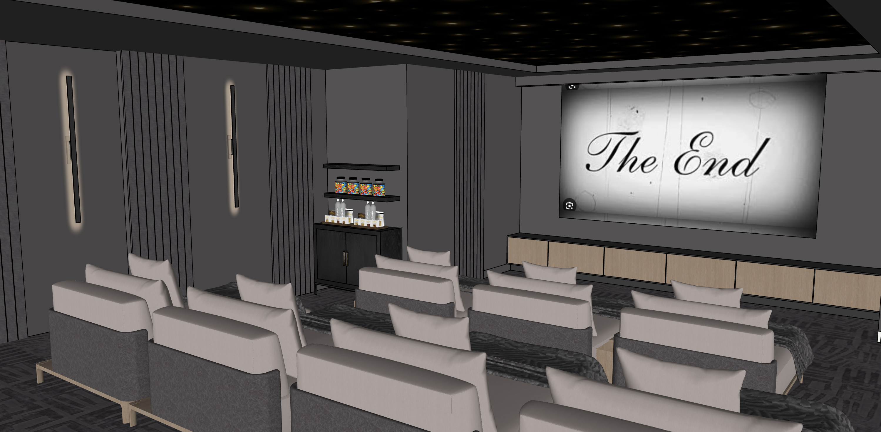 movie theatre room linear acoustic panels slim sconces starry ceiling maintain millwork colors cabinet is black wood with black shelving lightign under shelving