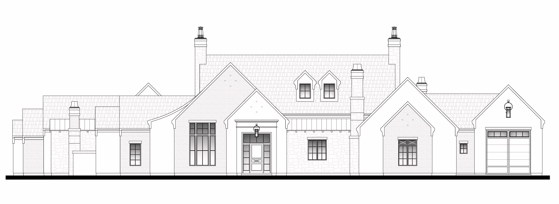 the roof is a black slate tile roof the areas that have a stone pattern should be a berkshire rubble from soltice stone and the the walls with brick should be a birch or a tan color the walls that are blank should be a smooth stucco look at the details the walls on the left side stagger the are moving towards the back of the house its not one long row it has staggers so make sure to adjust for that the roof lines will make that clear the should go back about 10 feet every harsh roof line there are metal roof sections so pay attention to that the window trim is all black the garage door on the far right is an rv gargage the reference image shows the stagger a little more clear