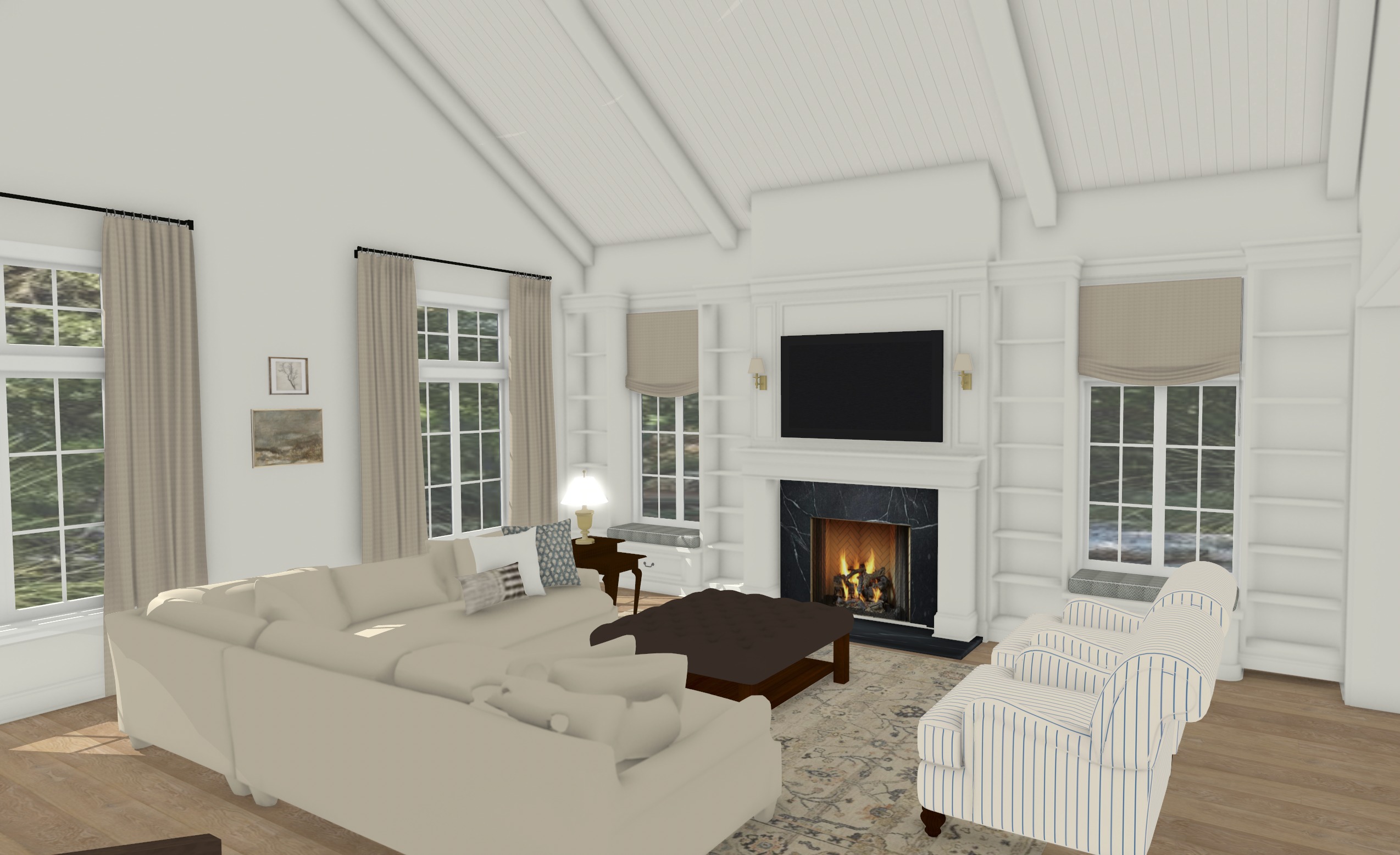 maintain all colors and textures the room should feel warm but light white style the bookshelves with books photos with a nancy meyers asthetic
