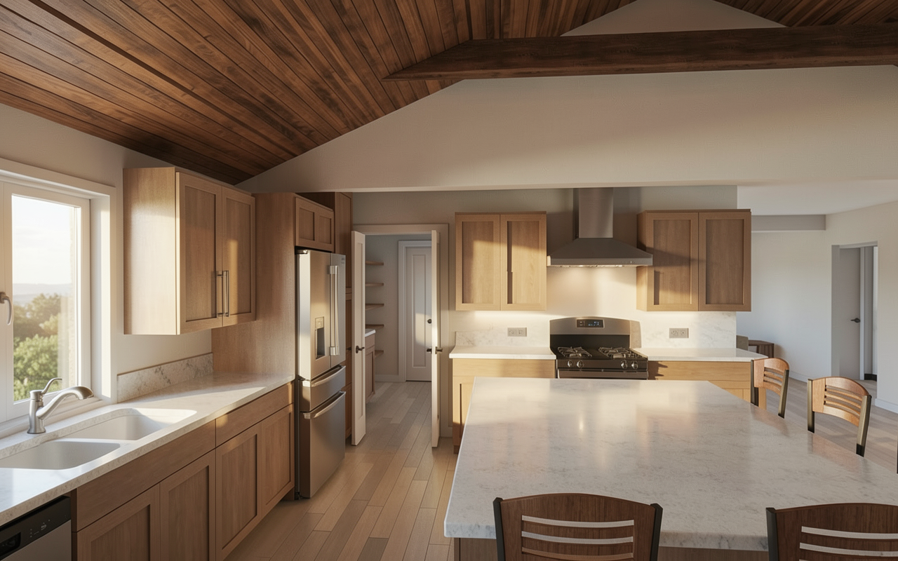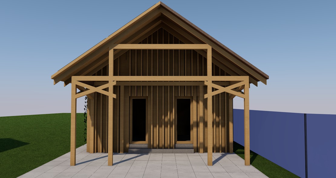 keep my shadows and the position of the sun do not change the shadows make them exactly as they are in my image the house cladding and all wooden elements should be made of wood slightly faded with a subtle hint of modern add soft reflections to the glass dors where i have paving replace it with xl format medium grey concrete paving with no visible joints modern paving where i have grass add a realistic beautiful lawn