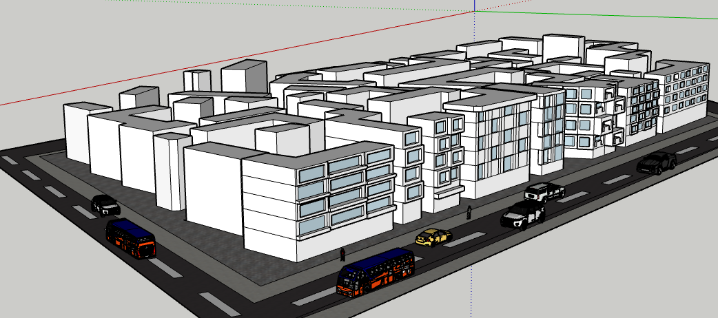 urban architectural scene modern buildings with sleek white facades and large reflective glass windows display a lively street with diverse colorful vehicles a vibrant orange and blue bus a classic yellow taxi and sleek black cars set against a crisp clear blue sky with soft ambient daylight to create a bustling contemporary city atmosphere highlight shadows for depth and texture maintaining a clean and stylish aesthetic
