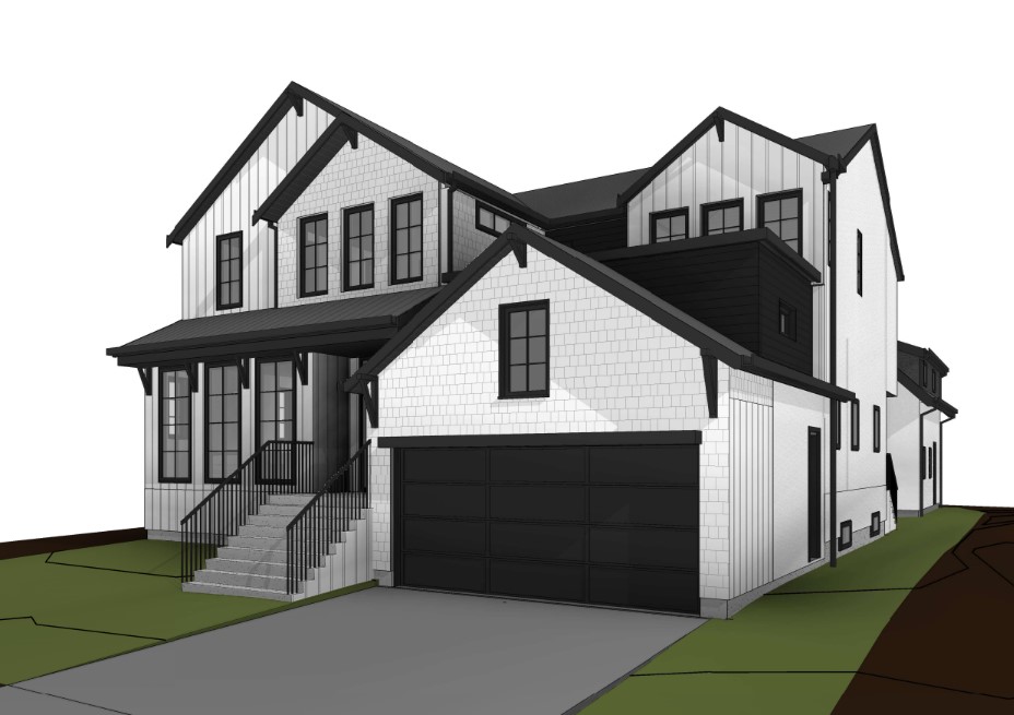 render a modern two story house with a black and white color palette it s a modern farmhouse style home the house features a black roof and black window frames contrasted by white siding and white trim the garage doors are also black the pathway and stairs are light gray leading to a well maintained green lawn set this scene in a bright sunny atmosphere with clear blue skies casting natural shadows and highlighting the modern architectural details the overall mood is contemporary and inviting the landscape should be modern with grasses and lavendars sunny day with some clouds architecture