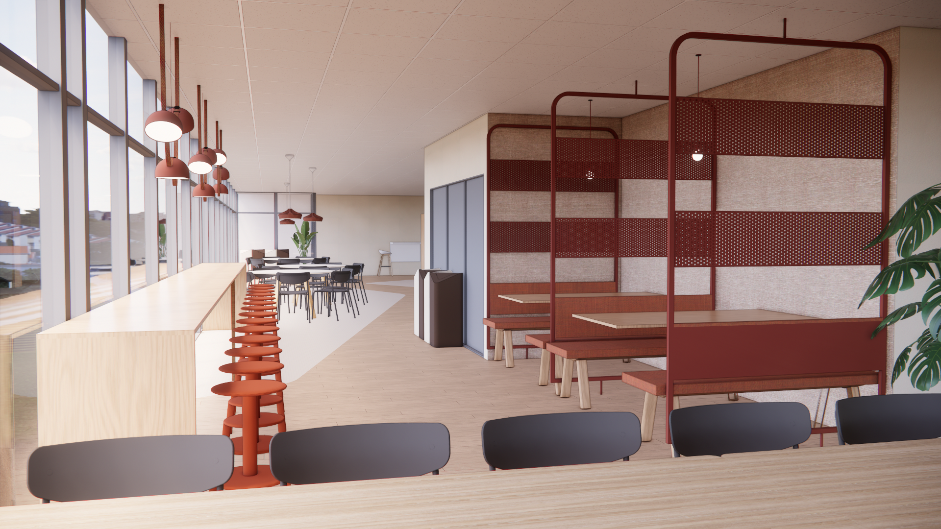 render a modern minimalist kitchen space with a warm and inviting atmosphere metallic terracotta orange structure natural wooden floor connected to terrazzo beige terracotta flooring the overall mood is calm stylish and welcoming with an emphasis on simplicity and elegance