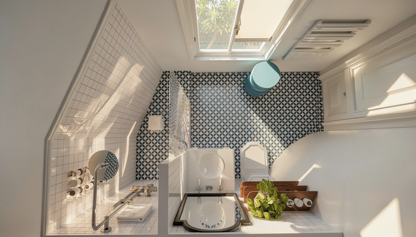 photorealistic interior render based on the original scene composition unchanged layout and camera matte wave effect porcelain surface integrated in the design floors and walls in polished concrete with subtle tonal variation and realistic texture marble table with natural veining refined and non glossy finish poufs upholstered in dense texture fabric in a matching tone soft but structured appearance blue vinyl rug with textile effect slightly matte realistic fibers simulation lighting combines soft natural daylight with carefully designed interior lighting creating a poetic atmospheric mood with gentle contrasts and depth add a receptionist behind a computer naturally integrated into the space realistic posture give the stair landing a clear sense of depth and spatial development with well defined geometry and perspective physically accurate materials pbr no plastic look no artificial shine editorial architectural style