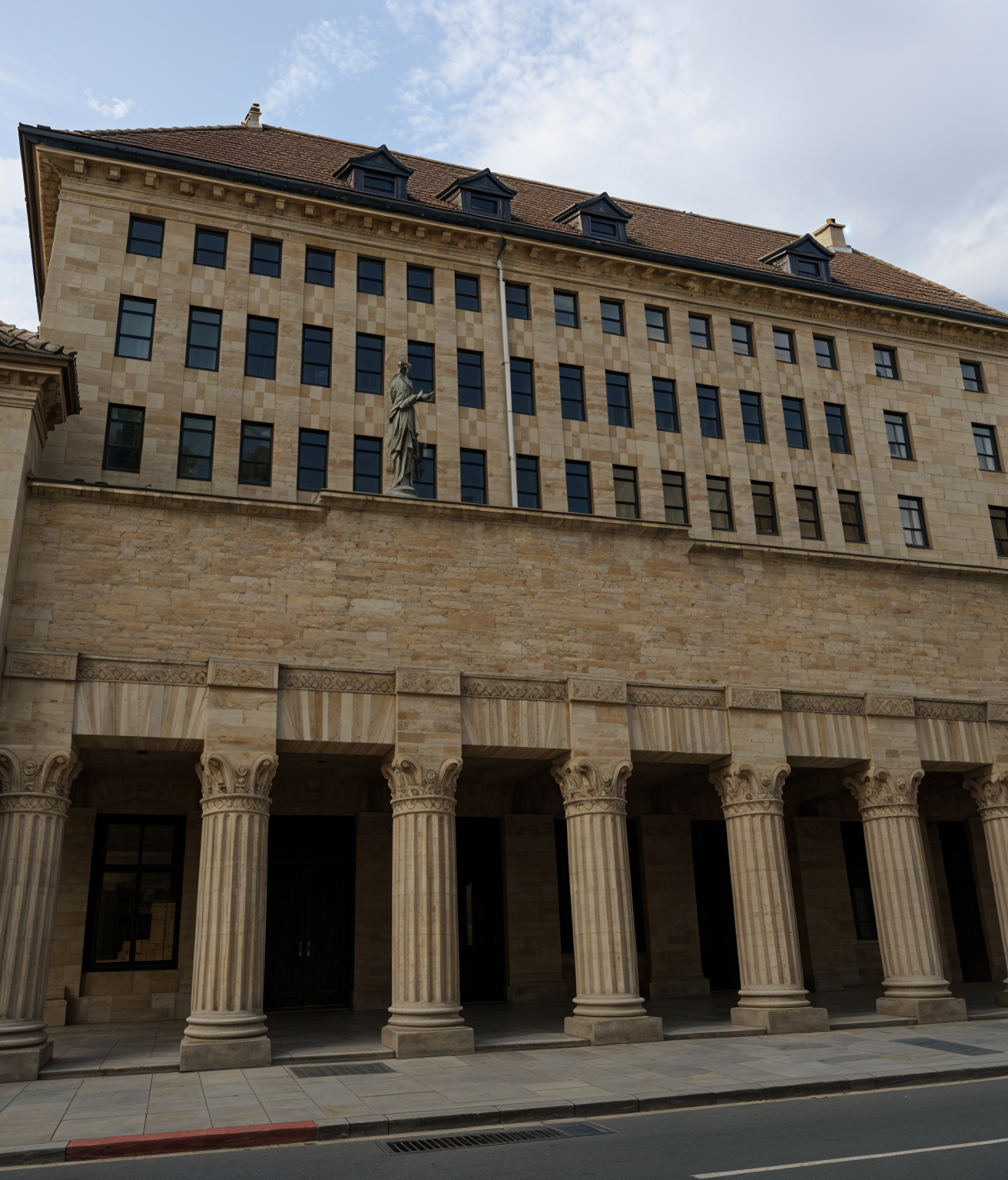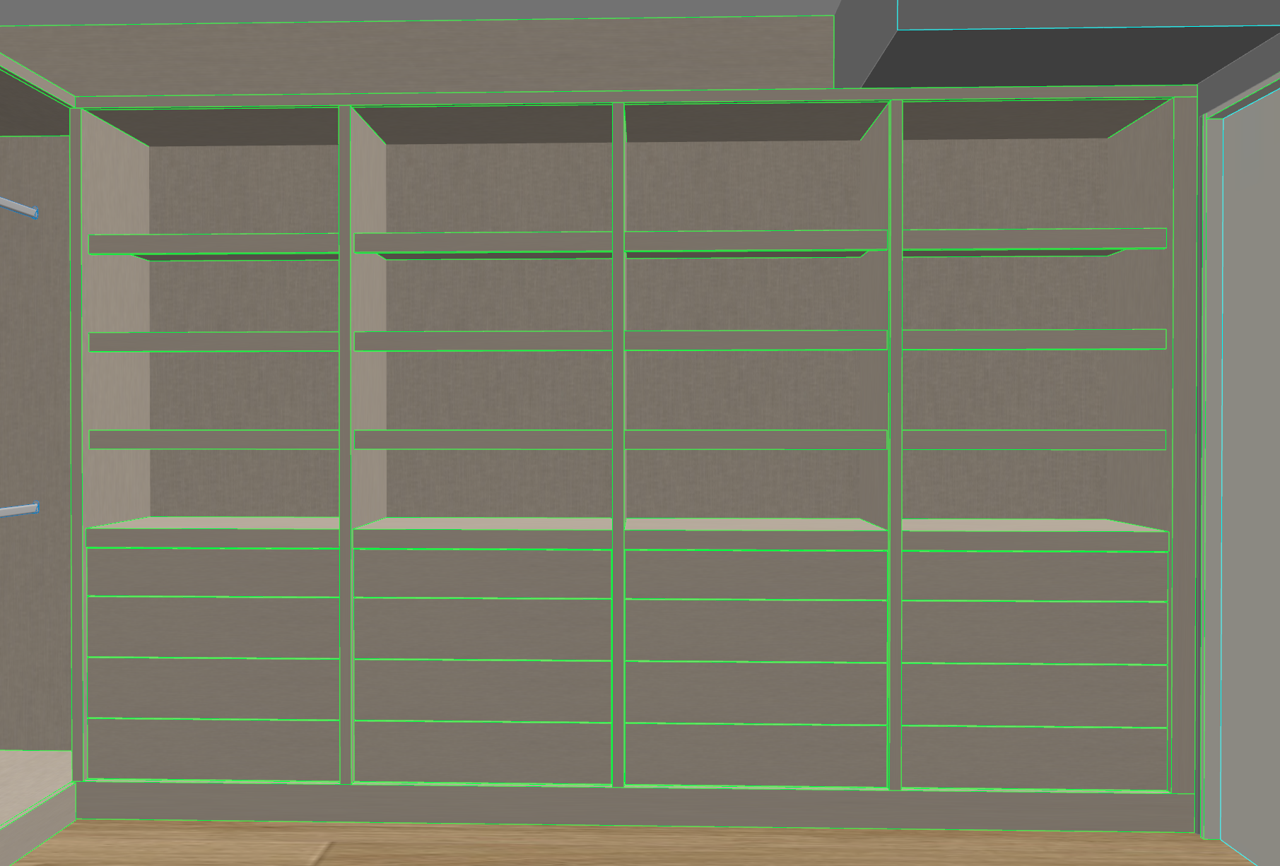 a spacious modern wardrobe with elegant shelving featuring a sleek beige wood finish the background is soft charcoal gray with a touch of light reflecting on glossy surfaces illuminated by gentle warm ambient lighting creating a cozy and inviting atmosphere the wardrobe s layout is symmetric and organized enhancing a sense of order and sophistication the room floor is polished light oak wood adding warmth to the overall appearance