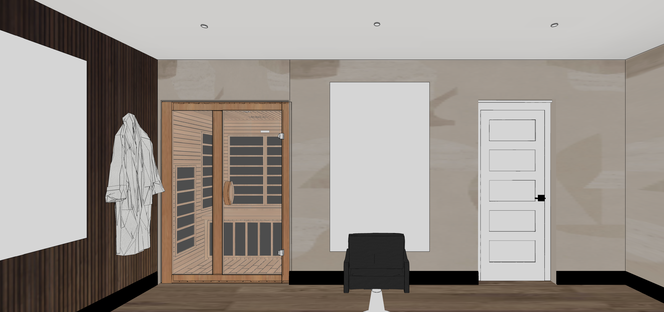 generate a realistic rendering of this seating room do not change the textures furniture or anything else just enhance it and make it more realistic the sauna is on the left side inside of a closet that will be changed to the sauna the white rectangle is an led mirror with light on the sides there is a bathrobe the chair is a hairstylist chair for my client the wall paper is on the clear one on the walls on the right and the on the left its walnut fluted panels the left rectangle is also an led mirror