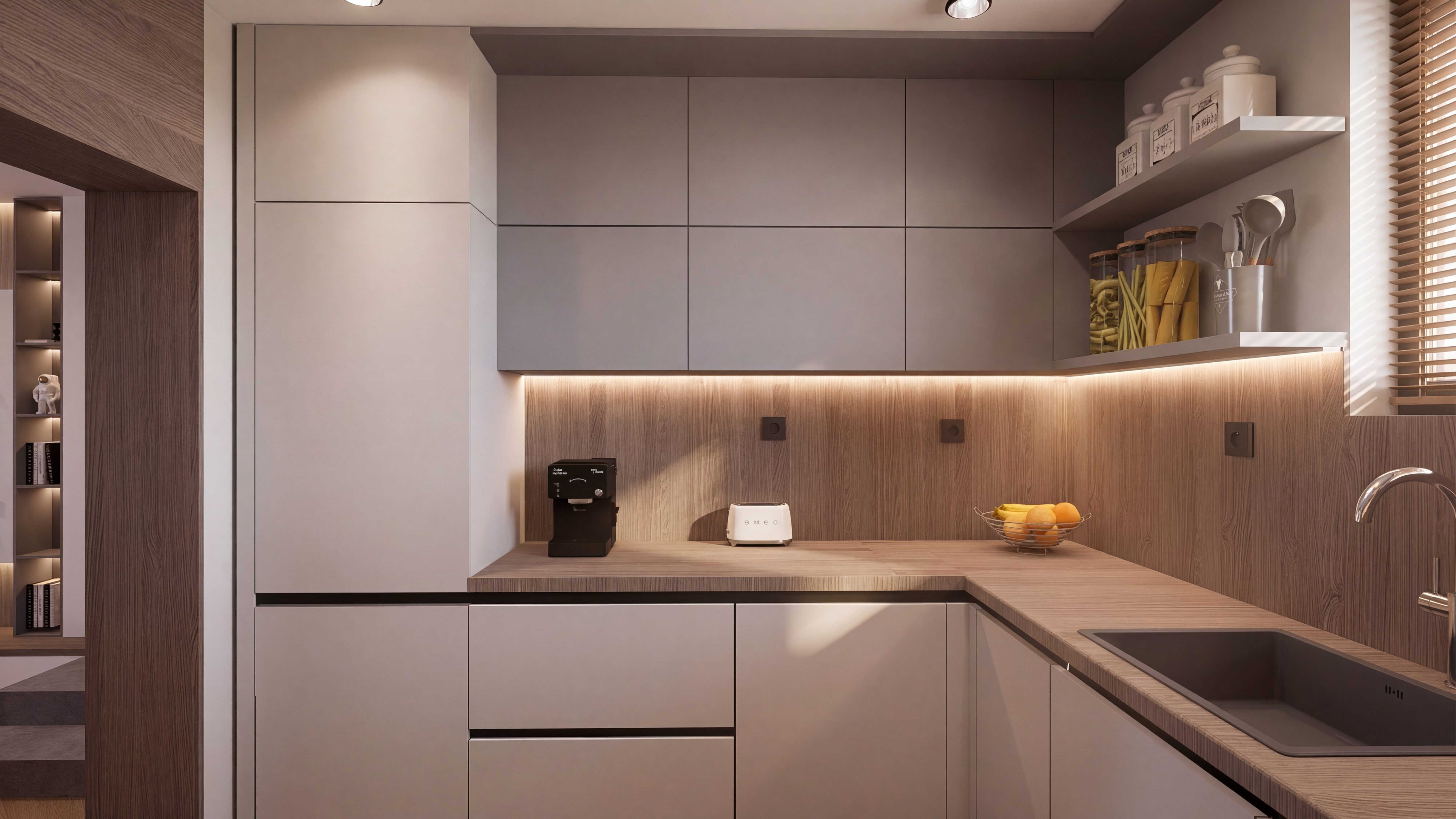 bobby mcalpine exterior shot make this a sport center render located inside a campus in china make the concept simple woody yet aesthetic with nature make it look like a sport public space with people make it look like evening and dont use all wood combine with grey make the room with windows look like a gym architecture