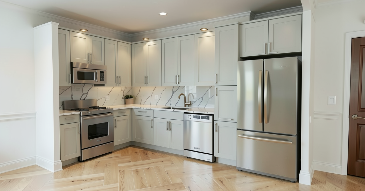 a modern two story house with a sleek design the walls are a mix of deep charcoal grey and warm tan wood paneling large windows with black frames the garage doors are graphite with frosted glass inserts the roof has a flat contemporary style the setting is during golden hour with soft warm sunlight casting gentle shadows enhancing the structure s lines the sky is clear gradually transitioning from orange to deep blue there s a sense of tranquility and elegance the house is on a corner lot